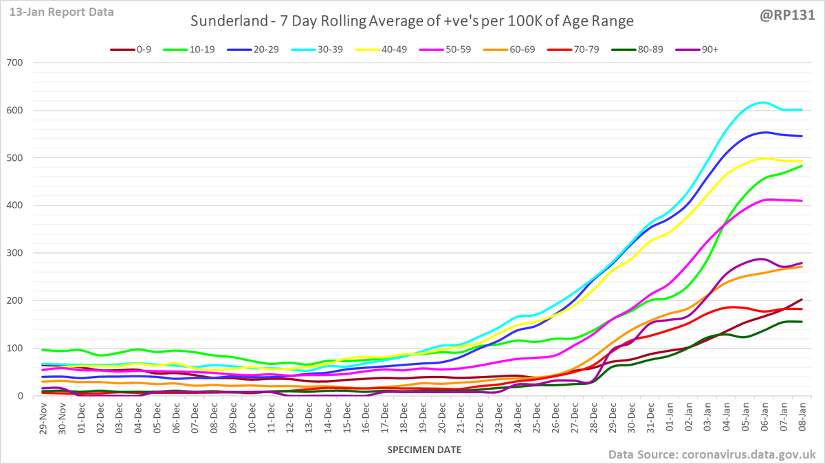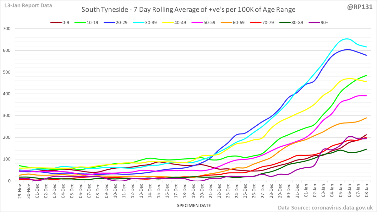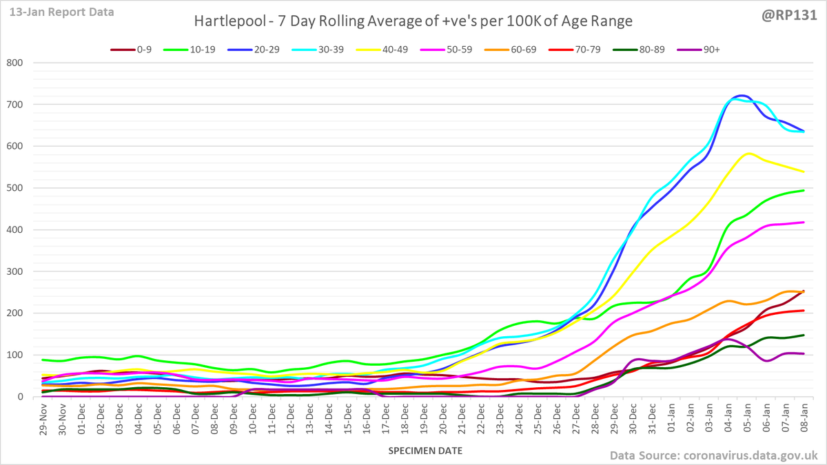 Age breakdown chart for Middlesbrough (current top LA). Rolling average of positive tests by specimen date per 100K population of each age range.