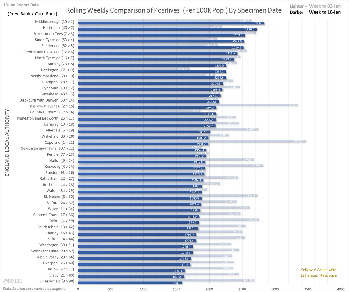 Rolling weekly comparison of totals up to 3 days ago. This chart is useful to see the relative movements of the local authorities towards the top of the list.