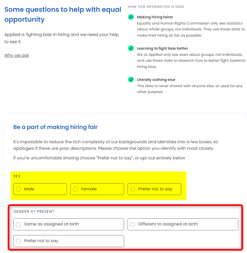That includes the EHRC who, although they ask for the sex of job applicants with the options of female and male, they also ask the nonsensical question of whether the 'gender at present' of the applicant is 'same as assigned at birth' or 'different to assigned at birth'. 14/15