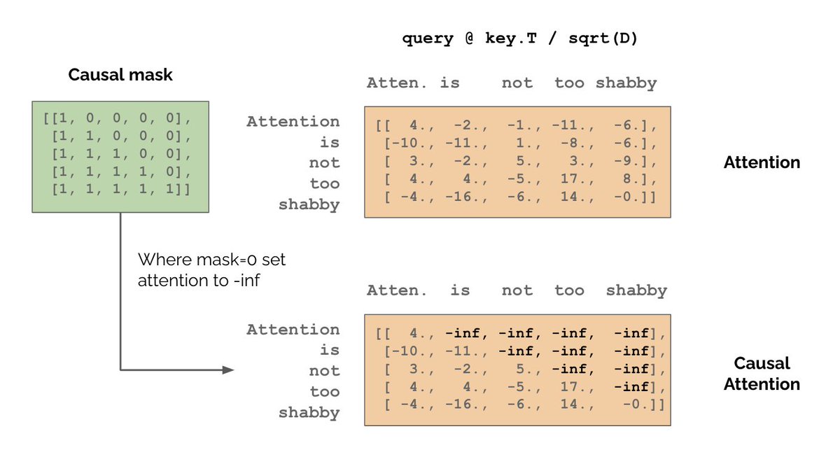 To predict future words we need to enforce causal structure. We can do this with the attention matrix. A value of 0 means “no relationship”. So we need to set attentions between current & future words to 0. We do this by setting Q*K.T = -inf for future words. Why -inf?