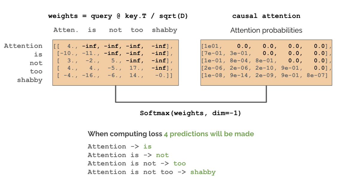 We want attention to be 0 for future words, but if we apply the mask after the softmax, attention will no longer be normalized. So we set QK.T where mask=0 to -inf and then normalize. Notice how although we only have 1 sentence we’re making 4 predictions.