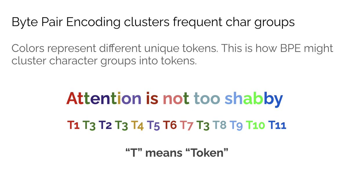 For simple problems tokenizing each char is OK. But it’s not efficient - char groups like “it” “the” occur frequently so we’d prefer to group them into their own tokens. For this reason, GPT uses Byte Pair Encoding which iteratively clusters common char groups into tokens.