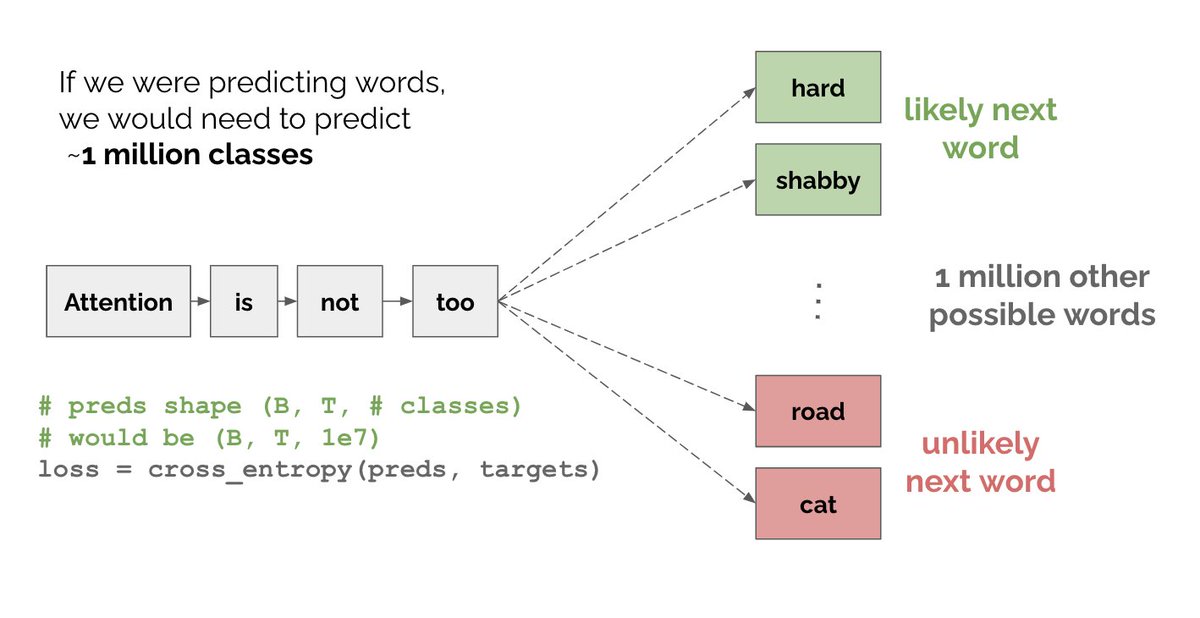 So far, we’ve been saying that GPT predicts words. That’s not entirely true. There are ~1M words in English - if we were literally predicting words each prediction would be a classification across 1M classes. To see this clearly, let’s write down the loss GPT optimizes.