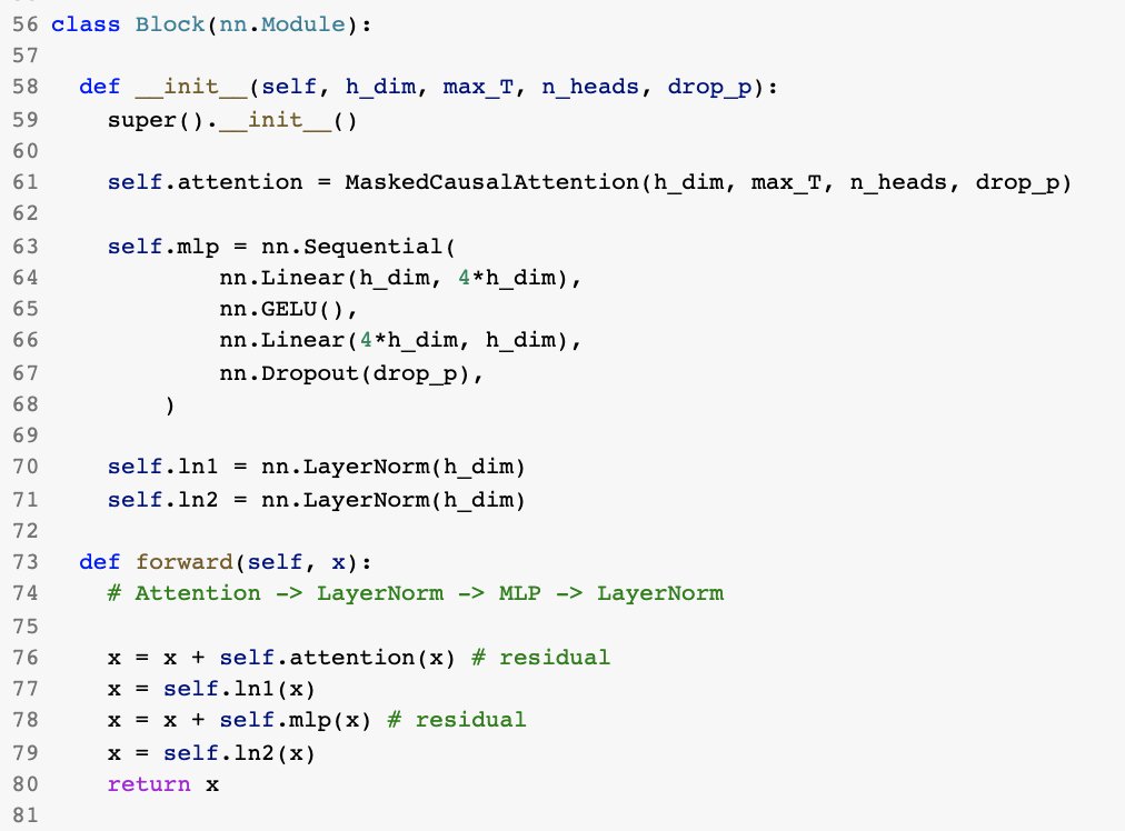 Masked causal attention is the main idea of GPT. Now we just need to define the full architecture. The transformer block for GPT is MHA → LayerNorm → MLP → LayerNorm. MHA does the bulk of the work, LayerNorms normalize outputs, MLP projects + adds capacity.