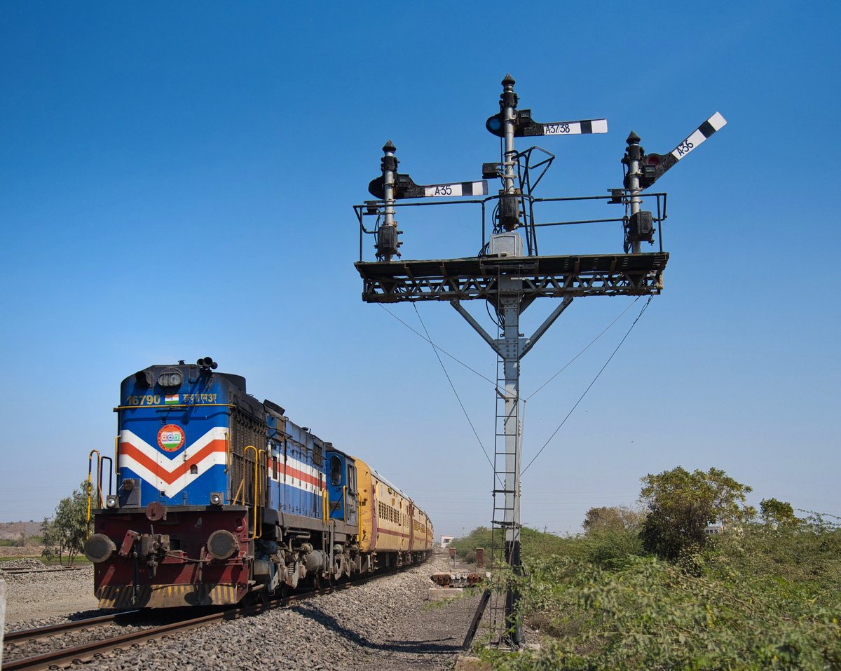 Pic 1: A Vatva #Alco hauls the Ahmedabad - Veraval intercity past the home signal semaphore gantry at Than in Gujarat's Kathaiwad. This upper quadrant semaphore territory saw the semaphores' last vigil on the #IndianRailways ' broad guage network. Pic from Feb 2022. Today, this line is electrified and the semaphores have given way to the less romantic, but much safer Multi-aspect colour light (MACL) signals.