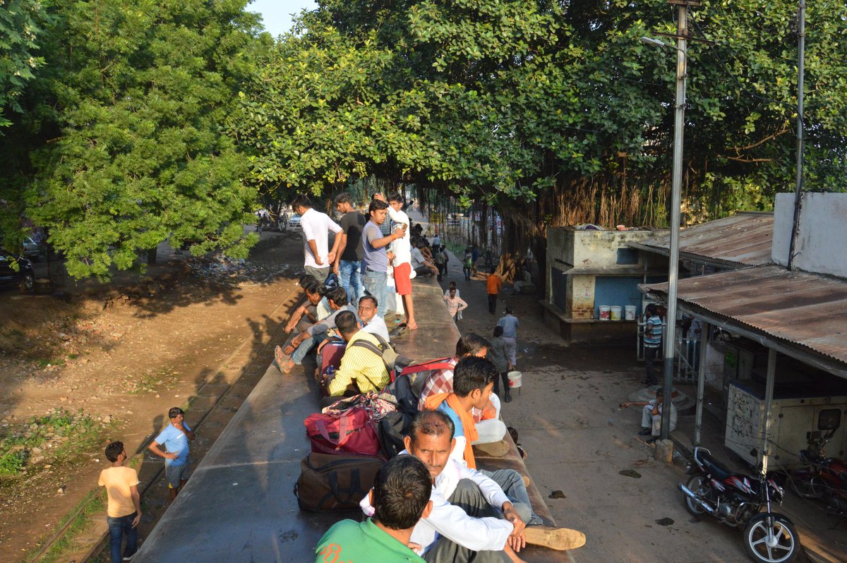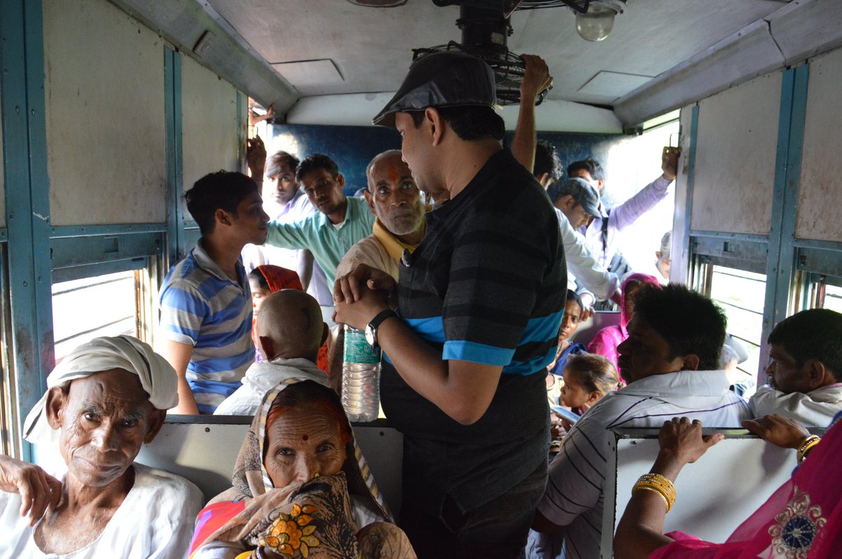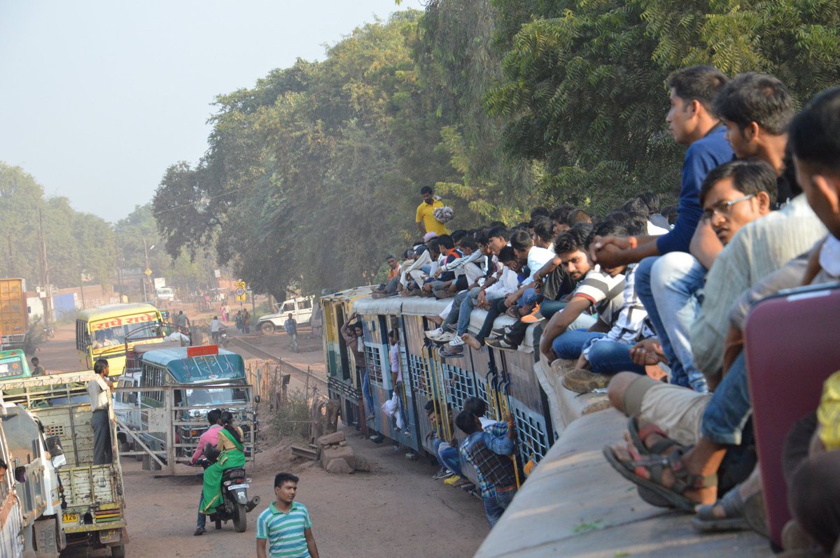 Because my cousin and I have endeavoured to take the Gwalior - Sheopur Kalan passenger today. Departing at 7, the narrow guage passenger meanders along the Gwalior - Guna - Shivpuri plateau, which is situated on the fringes of the Kuno and Ranthambore forests, to reach Sheopur Kalan, 199 km away. The journey will take a leisurely 12 hours. And the specialty : rooftop travel. These trains are vital links for the people around these parts to Gwalior, their biz and cultural hub. Naturally, these trains are heavily patronised. At the start, we aren't allowed to get on top. Jam-packed inside.