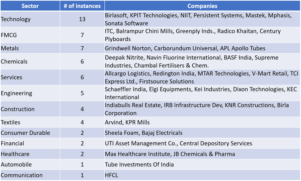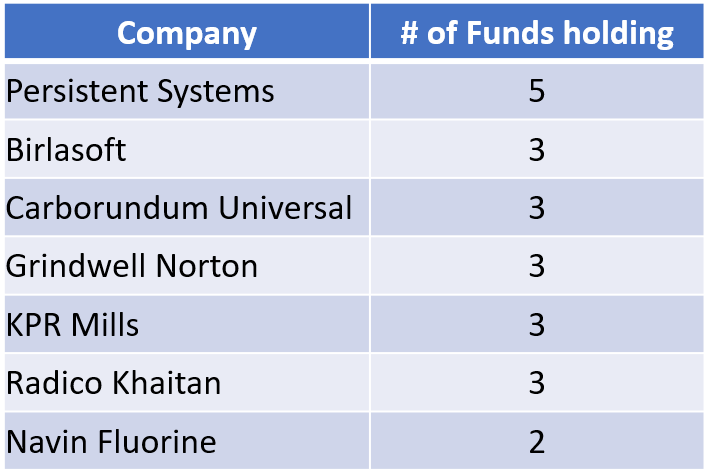 It's not surprising Technology is leading and Metals & Chemicals are in top 5. I am actually surprised Textiles' allocation was a bit conservative. Lets see the list of companies that are repeated in more than one fund.