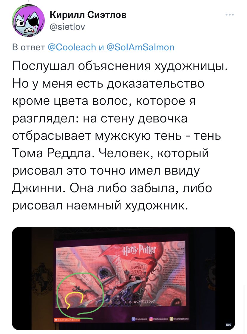 Апдейт по загадке Джинни/Гермионы со второй обложки. Спросил на главном сабреддите по «ГП», все однозначно указывают на Джинни. Зато теперь в комментах удивляются плащу, который почему-то носит Гарри на этом рисунке, и гадают, не задушит ли он его 😄