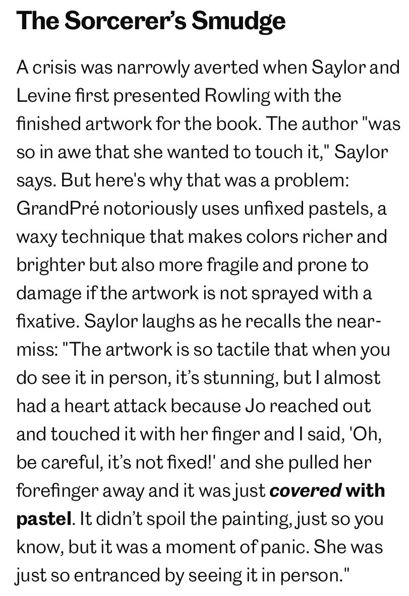 Издатели рассказывают забавную историю. Когда они при личной встрече показали Роулинг арт Мэри, писательница обрадовалась и дотронулась до рисунка, не зная, что он нарисован пастелью, которую легко смазать. Палец Роулинг испачкала, благо работа сильно не пострадала.