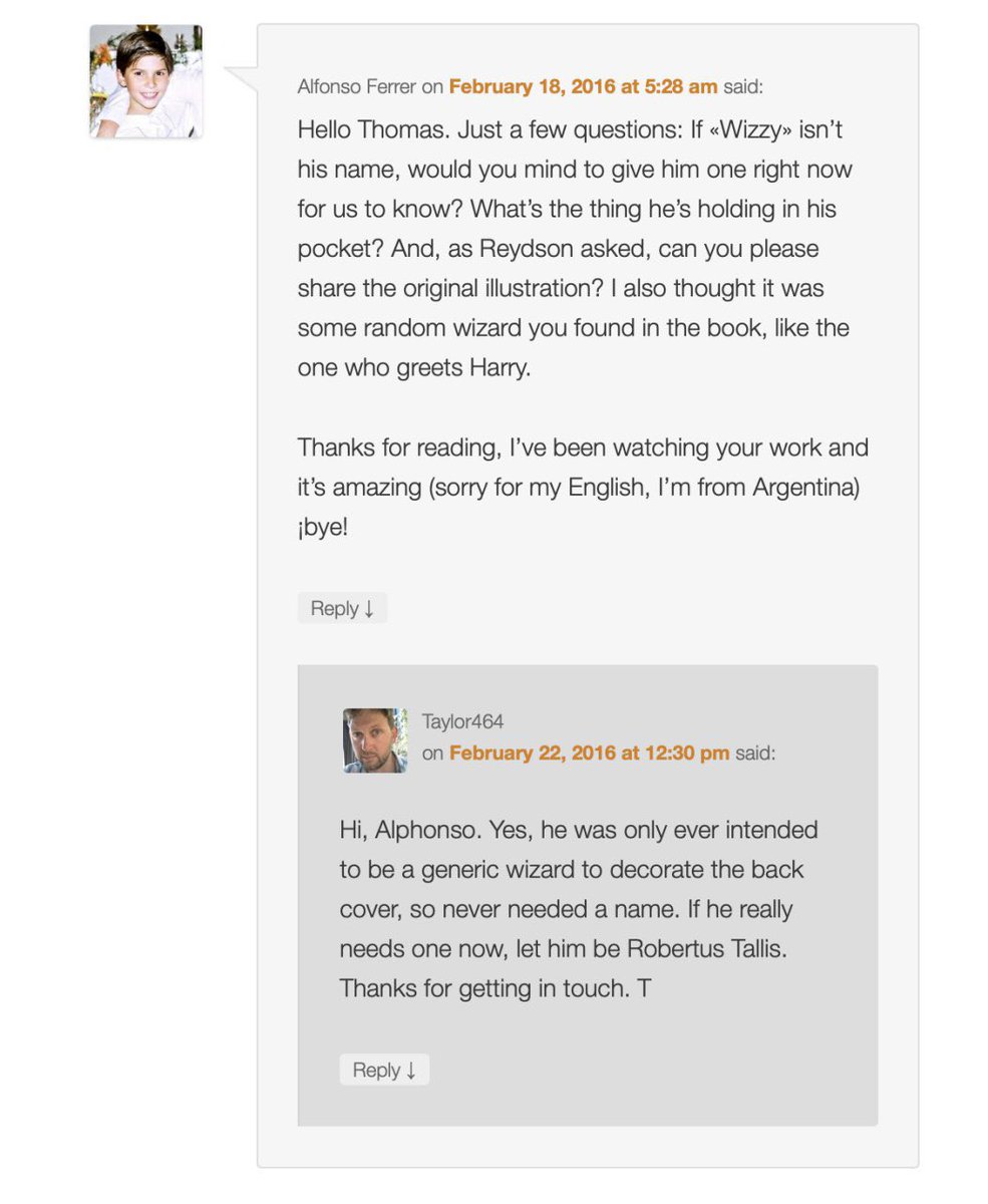 Какое-то время фанаты считали, что волшебника с трубкой зовут Wizzy, потому что файл с его изображением в блоге Тейлора назывался wizzy.jpg. Но сам художник рассказал, что название файла просто сокращение от wizard. «А если вам нужно имя, ну не знаю… пусть будет Робертус Таллис»