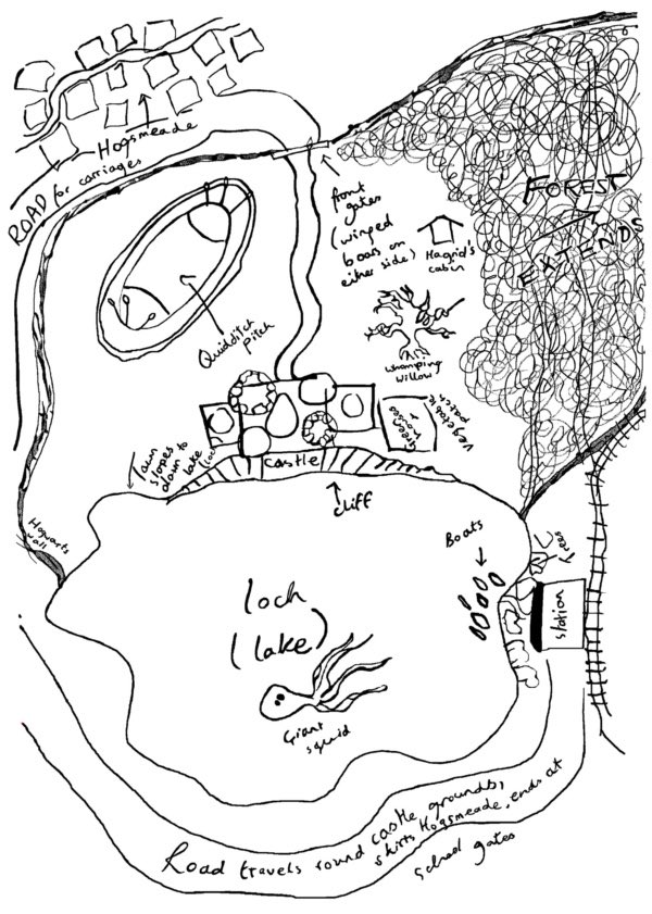 Пара карт Хогвартса и окрестностей. Из первой ясно, что до Хогсмида подать рукой, а замковая стена ограждает часть Запретного леса (интересно, законно ли с точки зрения кадастрового учёта). Расположение ж/д станции с функциональной точки зрения тоже вызывает вопросы 😄