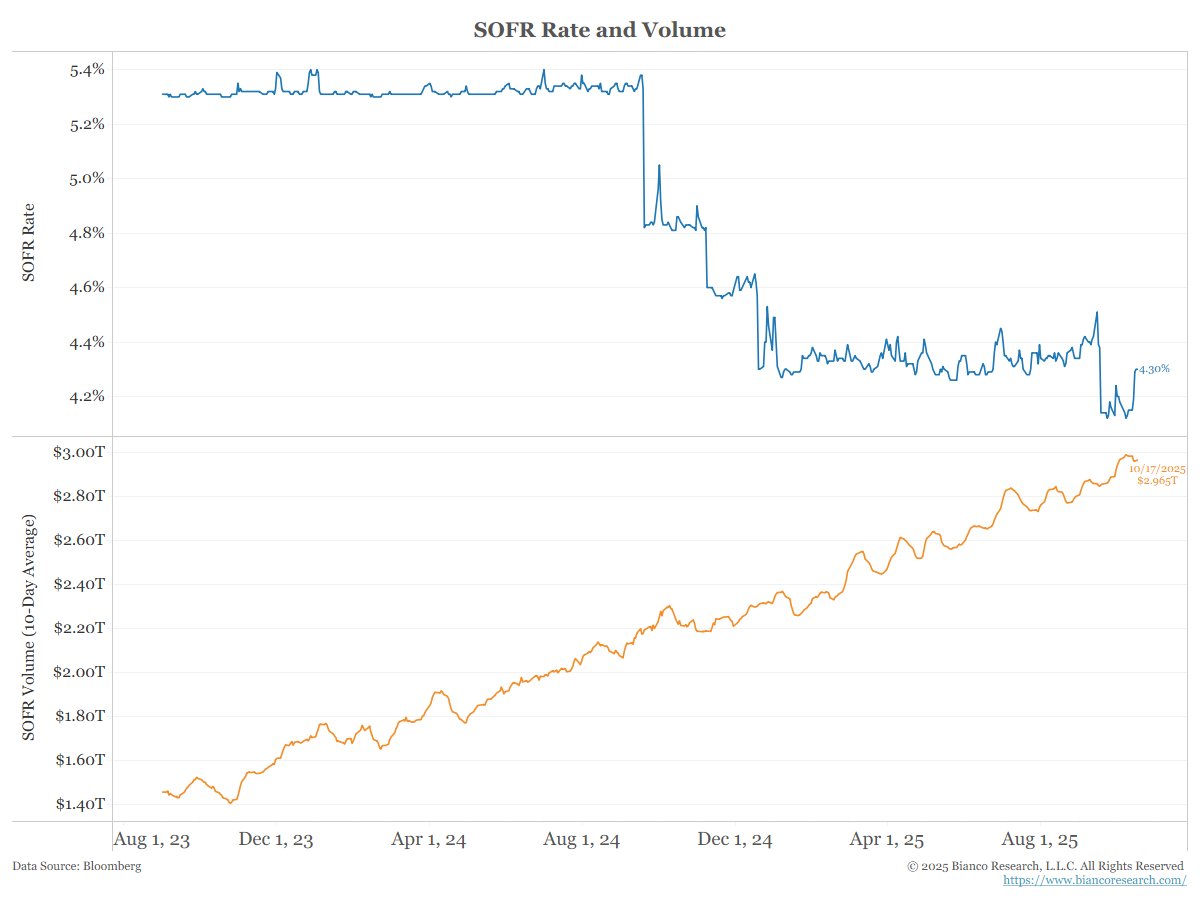 As the bottom panel shows, the SOFR market is now $3 trillion of overnight loans a day. It has doubled in the last two years.