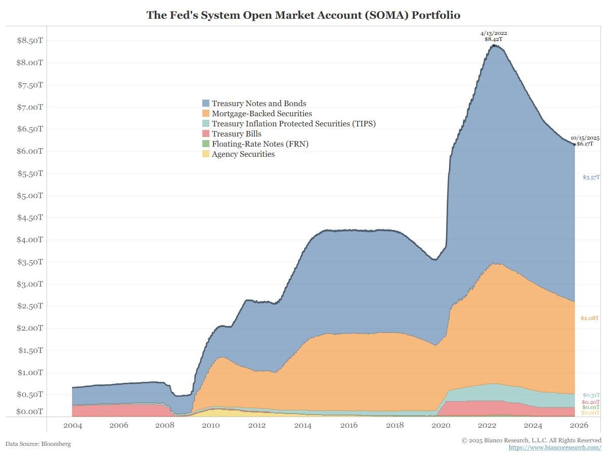 The answer to the first question is Quantitative Tightening (QT). This is the Fed pulling out liquidity since 2022 by reducing its balance sheet.