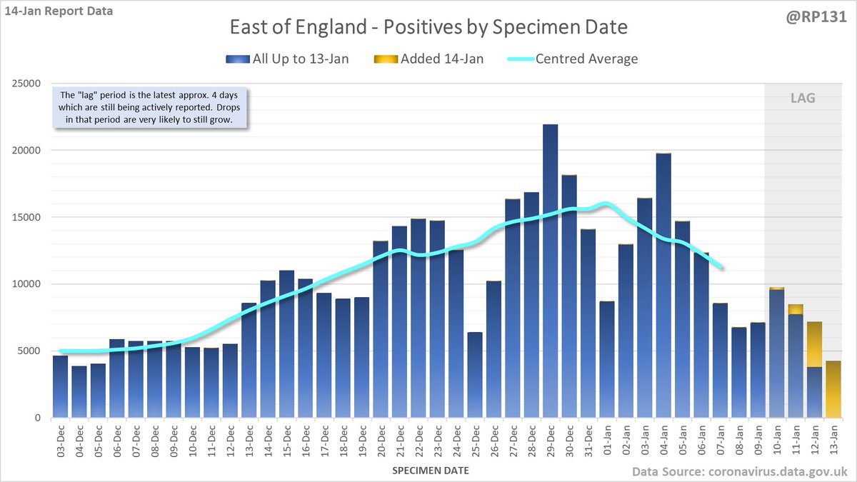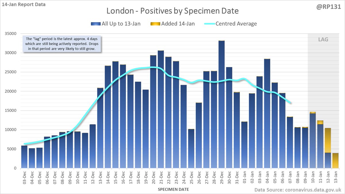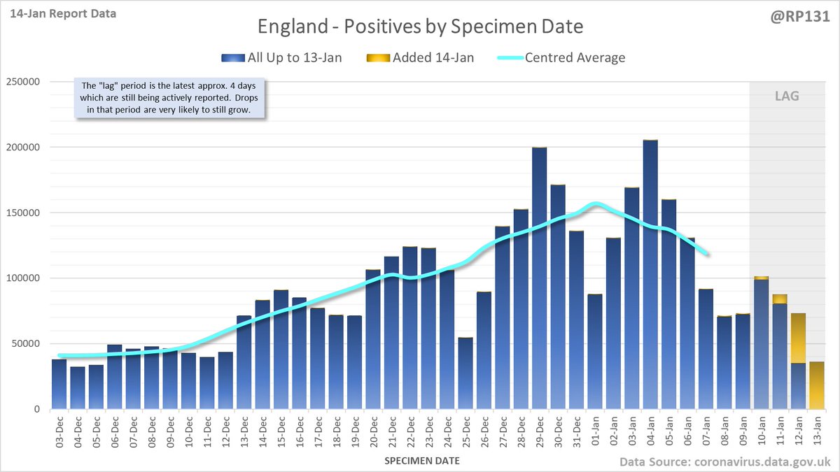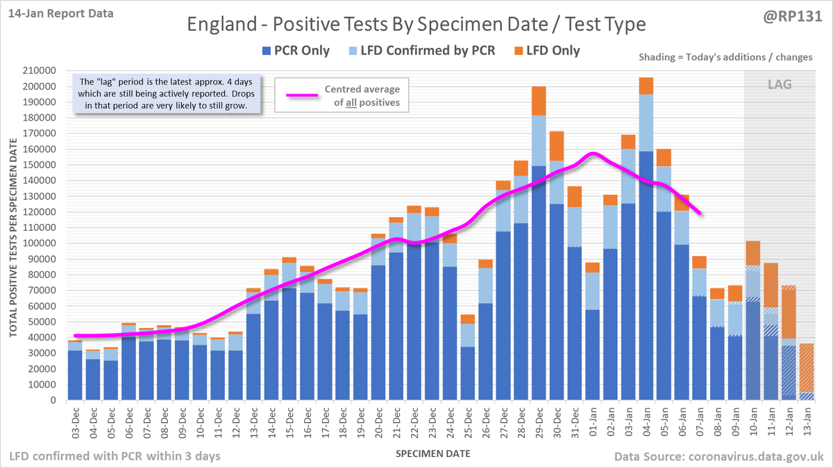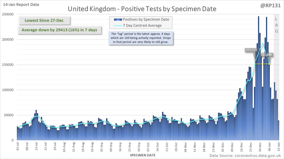 Longer term view. 99,652 new #covid19uk positive tests reported today (14-Jan). This brings the rolling average by specimen date (allowing 4 days for lag) to 151,896, equivalent to around 27-Dec (i.e. 11 days ago), a reduction of 29413 (16%) in the last week.