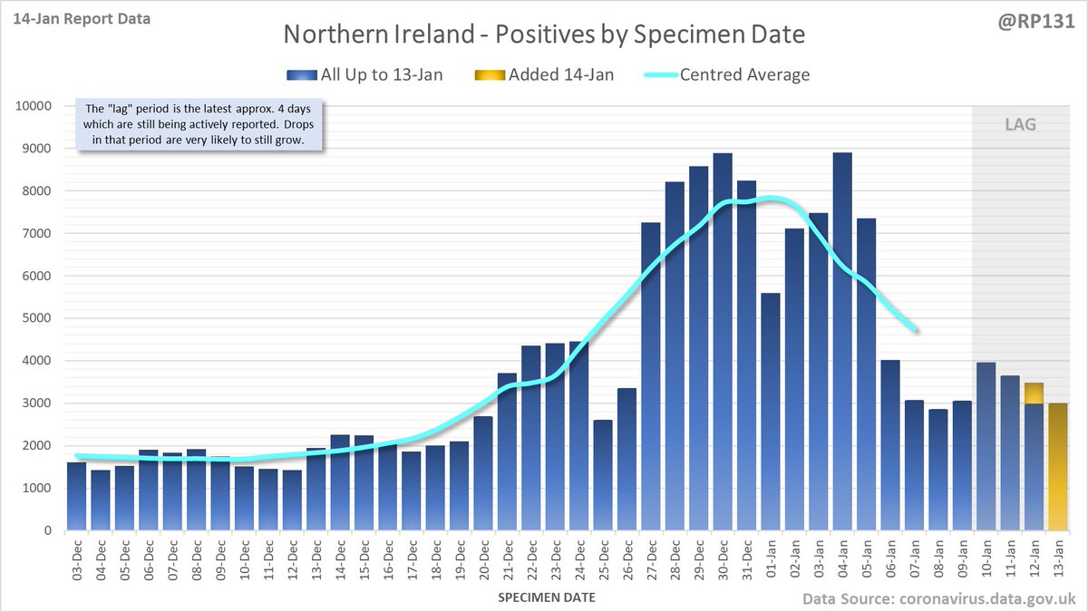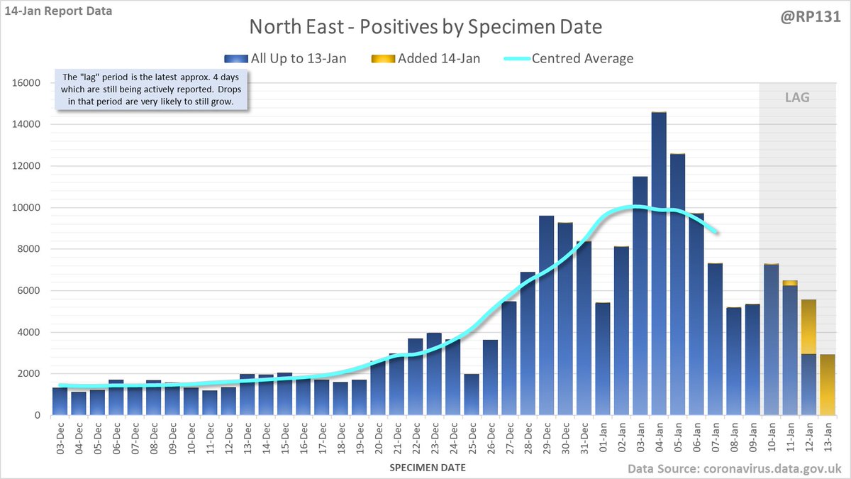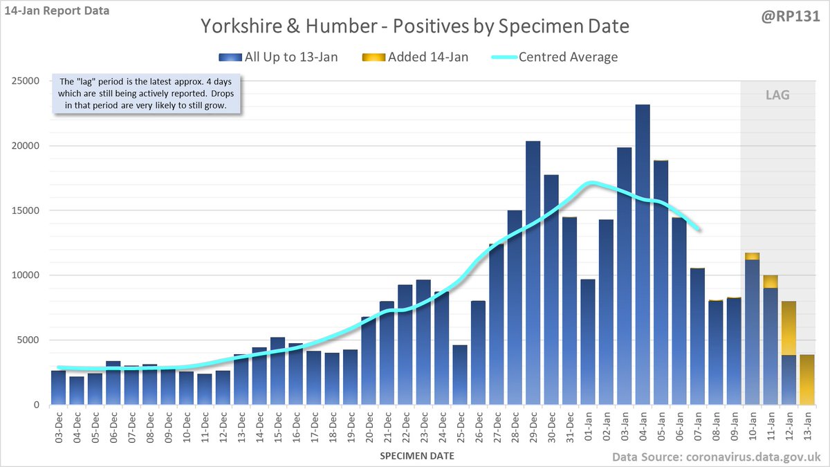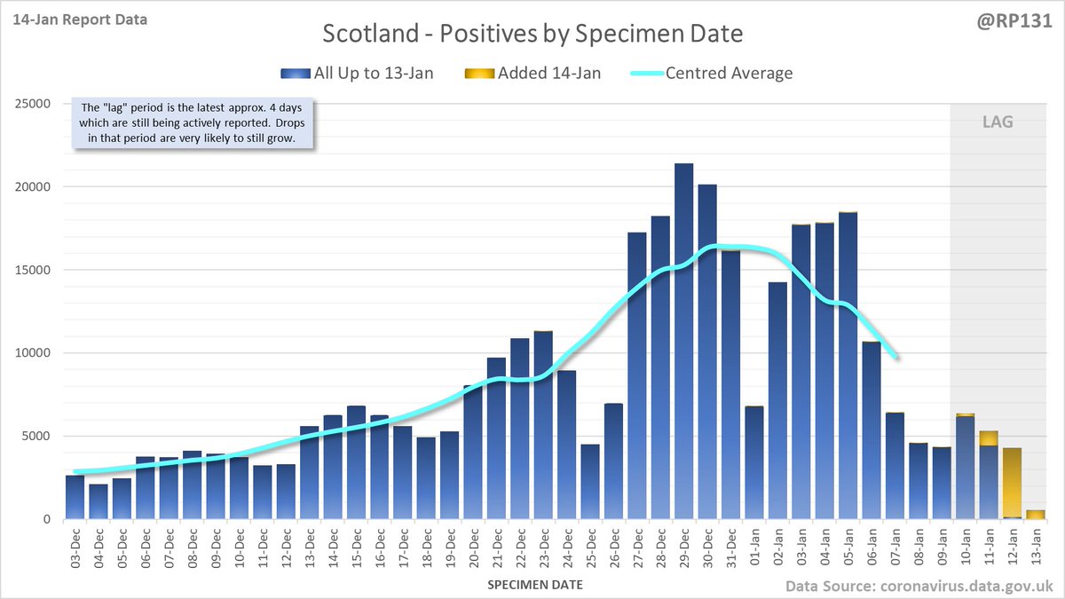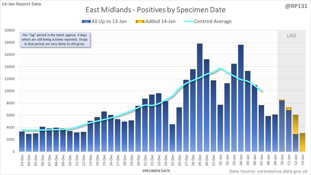 Longer term view. 99,652 new #covid19uk positive tests reported today (14-Jan). This brings the rolling average by specimen date (allowing 4 days for lag) to 151,896, equivalent to around 27-Dec (i.e. 11 days ago), a reduction of 29413 (16%) in the last week.