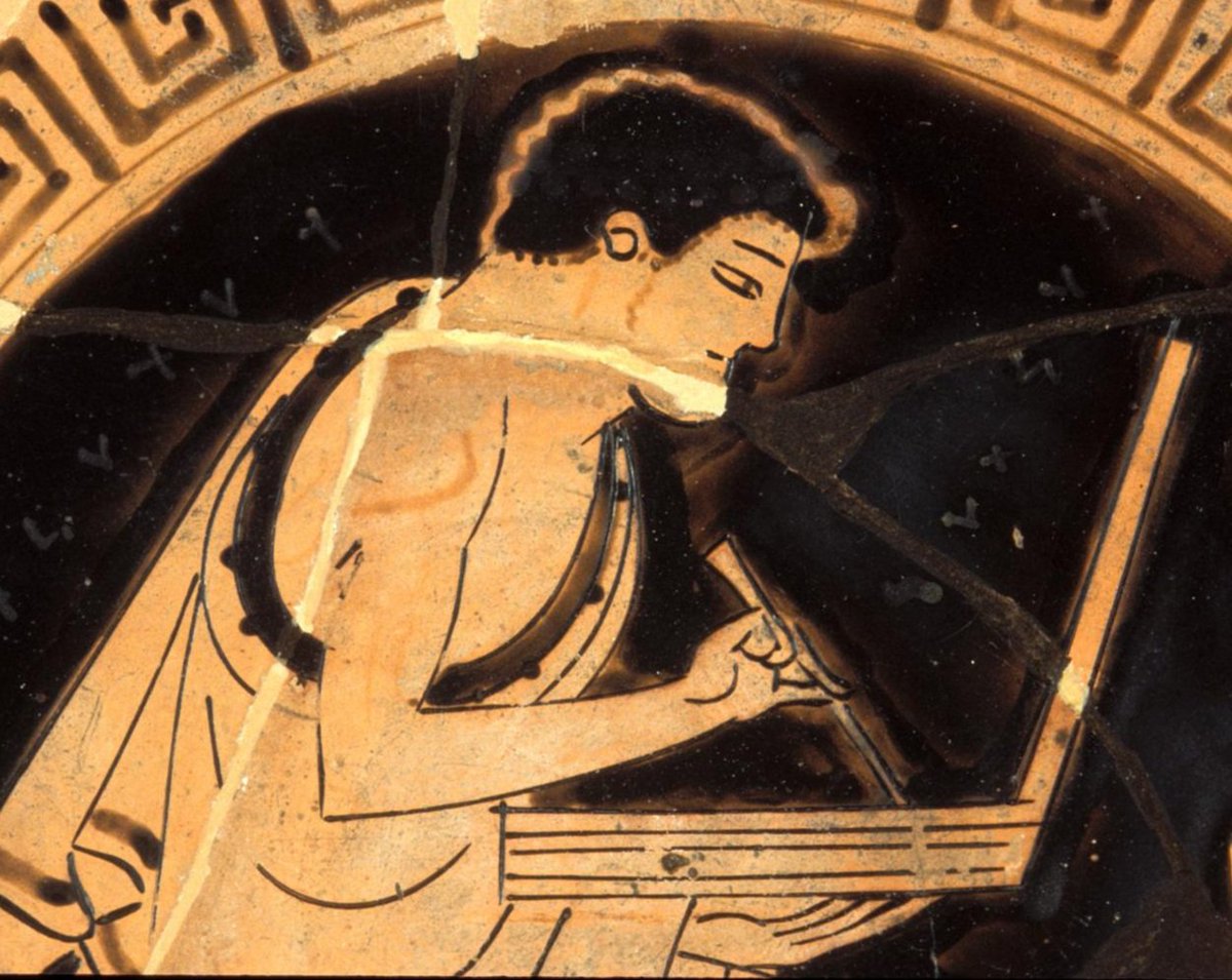 Red-figure Kylix depicting a sitting youth writing with a stilus on a folding-wax tablet (detail)-Greek ca.480 BC-the Eucharides Painter [1]