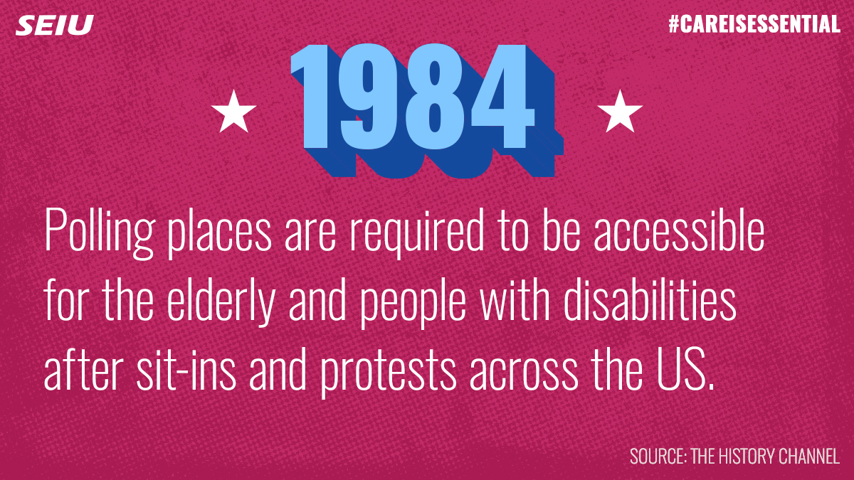 In 1984, sit-ins were held across the country demanding accessible voting locations for all. The Voting Accessibility for the Elderly and Handicapped Act made it law for polling places to be ADA accessible & aids be available, such as large-font prints.