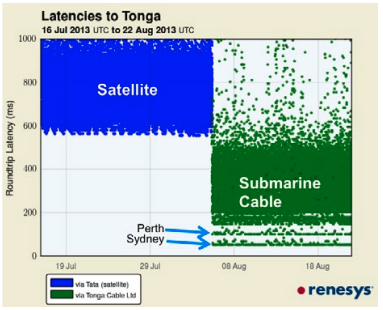 In Jan 2019, the subsea cable serving Tonga suffered a fault and the island nation had to revert to satellite to maintain connectivity.