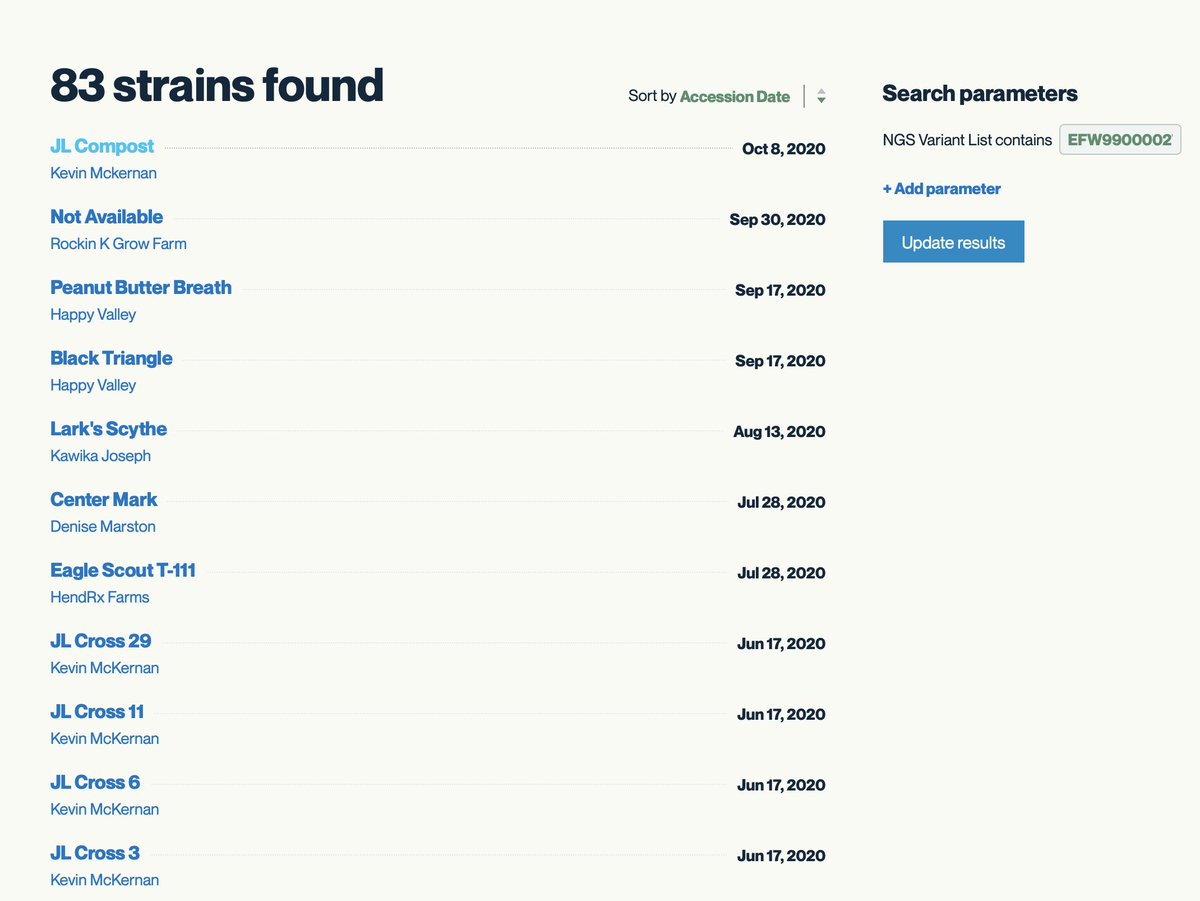 8 other strains share this rare mutation. It is close to the end of the gene and its not clear what the function of this mutation is but in general Proline changes should be monitored. kannapedia.net/strains?NGS=EF…