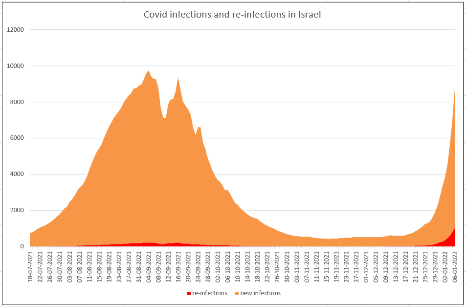 Now, in Israel's Omicron wave, recovered people seem to be catching the virus at about the same rate as everyone else. Maybe even a little bit higher, proportionally speaking.