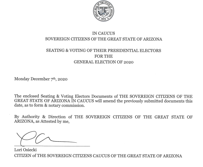 Arizona's fake certificate, submitted by one Lori Osiecki of Mesa, AZ, is a Sovereign Citizen thing proposing eleven random Trump supporters as their Electors. It was widely reported at the time.