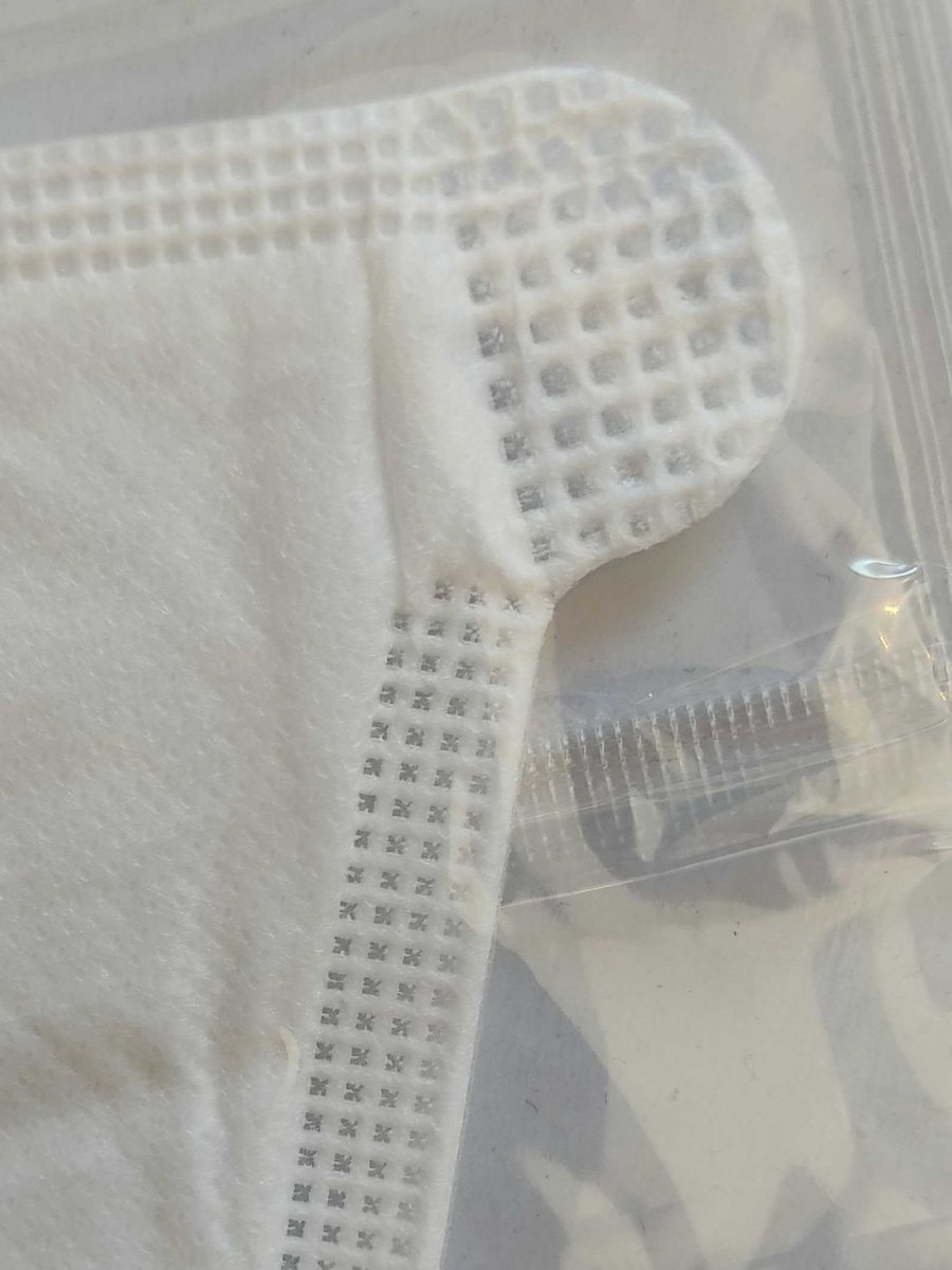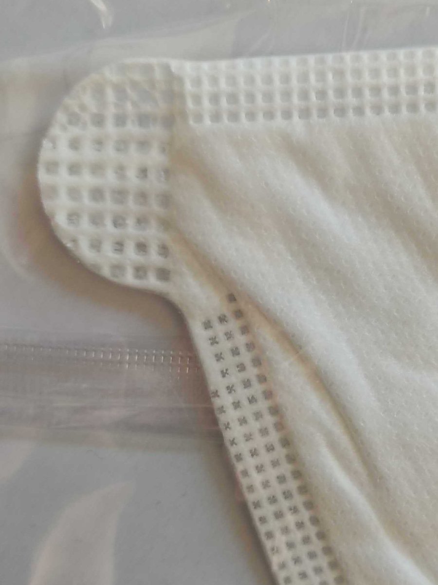 Bizarrerie sur ce masque : la soudure n'est pas symétrique et il semble y avoir une zone non soudée sur le côté (photo 2). Lors du port, un petit trou semble apparaitre à cet endroit (photo 3).
