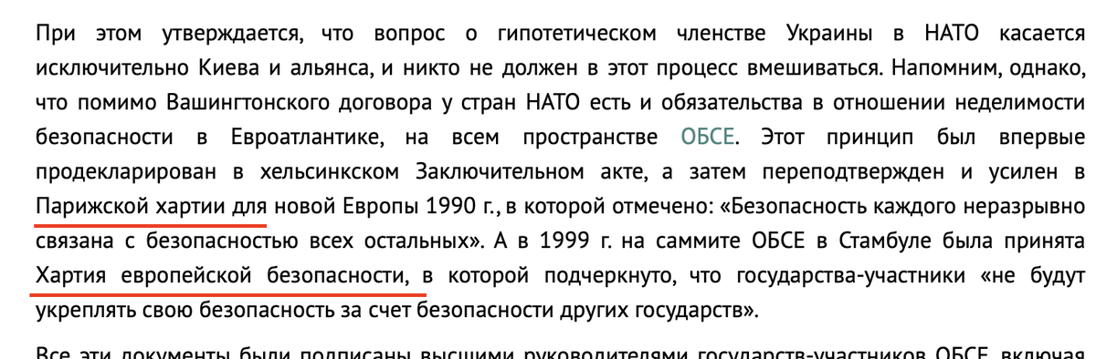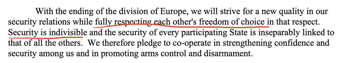 Let's check the 1990 Charter of Paris first. osce.org/files/f/docume…. Here's the relevant paragraph. What do we see here? We see that Lavrov is right (re "indivisible" security) but we see that he ignored another sentence in the same paragraph about freedom to choose alliances.