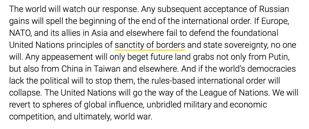 The op-ed has a lot of history. Problem is, the "beginning of the end of the international order" refers to international order created in 1945, which entailed "acceptance of Russian gains," including significant territorial changes. Awful? Yes.But let's not kid ourselves.
