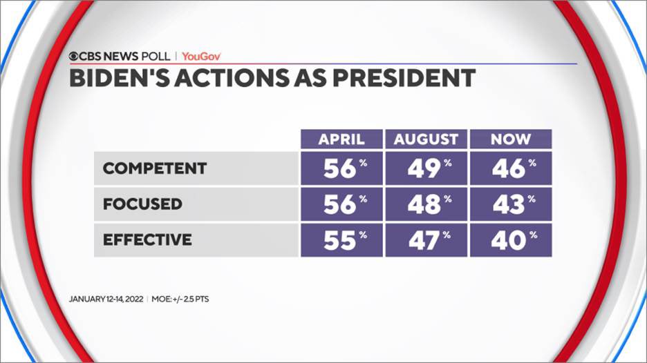 BIDEN’S ACTIONS AS PRESIDENT: Fewer than half describe @POTUS’s actions as “competent”, “effective,” or “focused.” More now call him “distracted.”
