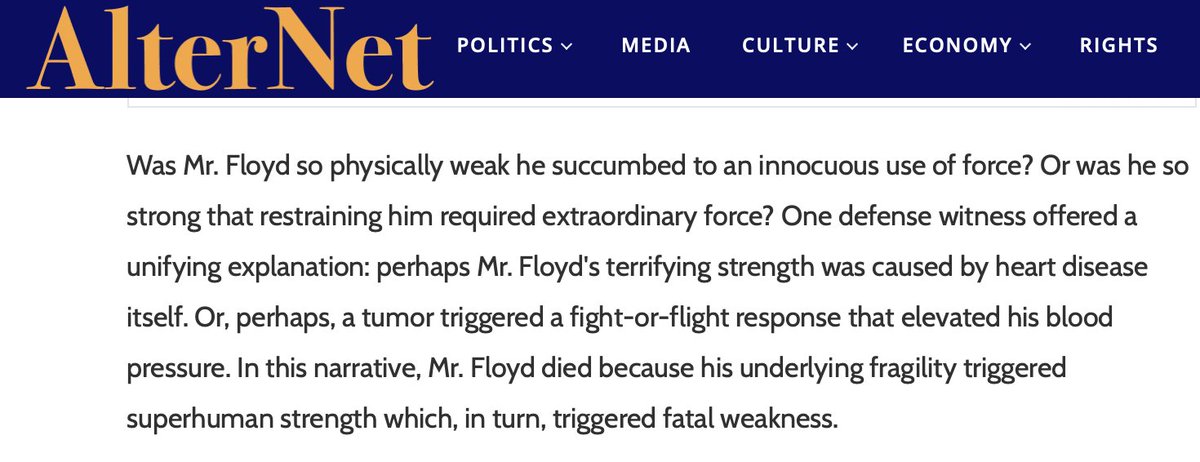 In Derek Chauvin's trial for the murder of George Floyd, Mr. Floyd was portrayed as super-human by the defense & conservative media. Yet they also blamed his own "enlarged heart" for his death. This exact same contradictory explanation was mounted after the murder of Eric Garner