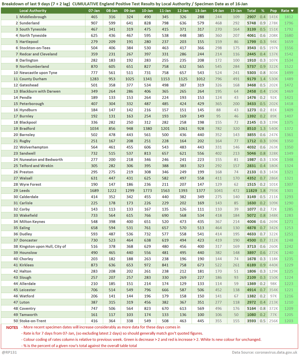 #covid19uk - Tables thread. Starting with the top 50 England Local Authorities by positives per 100K population in last 7 days, up to 3 days ago. Bright green means lower than previous period.
