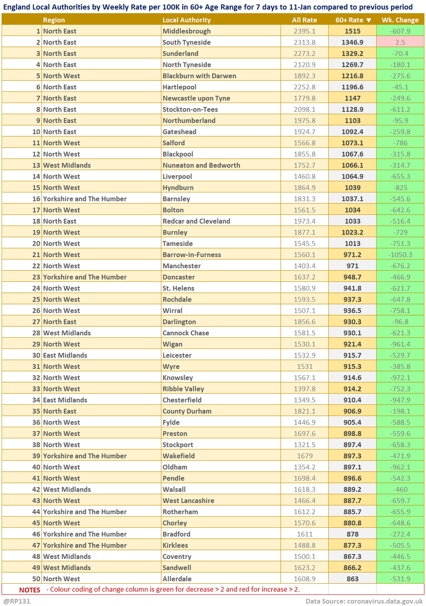 Top 50 table view of latest availble Local Authority data for the 60+ age range for 7 days to 11-Jan sorted by descending rate per 100K population (of that age range). Change column is compared to previous week with red for increase and green for decrease.