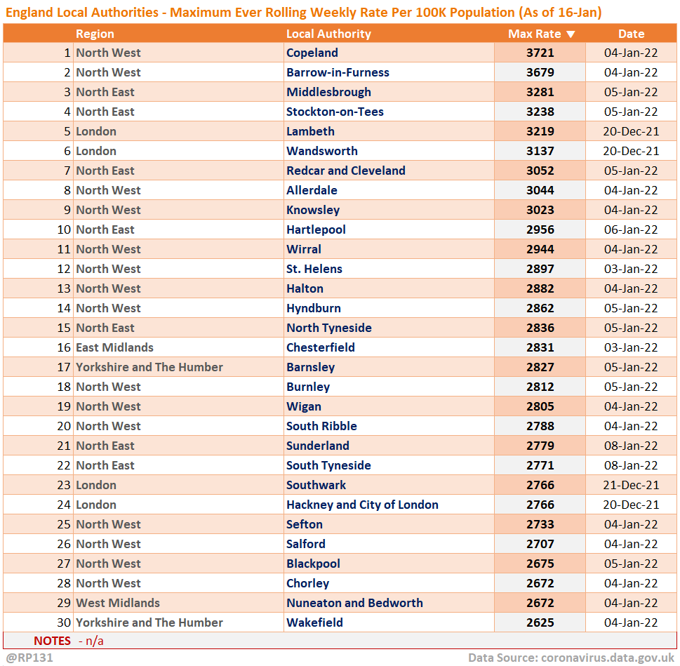 Top 30 England local authorities by maximum weekly rate per 100K population recorded to date.