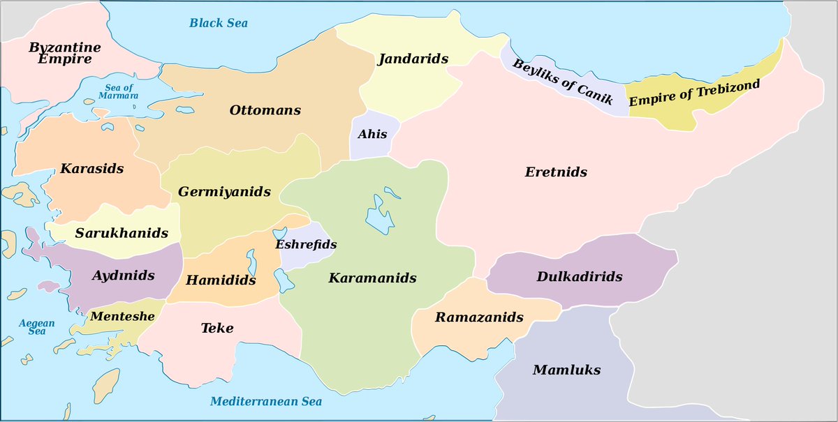 Anatolia was the Ottomans’ base of power, where they welded together the Turkic beyliks that formed in the wake of Byzantine retreat. This was a gradual process, and by the 15th c. several retained varying degrees of independence.