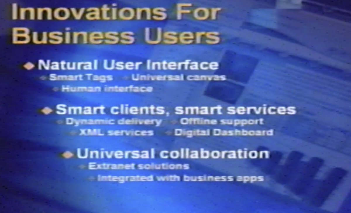 We showed early demos of "Hailstorm"—services and APIs "hosted" by Microsoft (mail, calendar, identity). Also showed business services ("bCentral") and a TabletPC prototype.