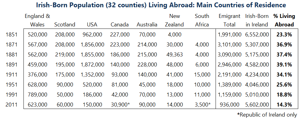 Almost 40% of the Irish-born population were living outside Ireland in the 1880/90s