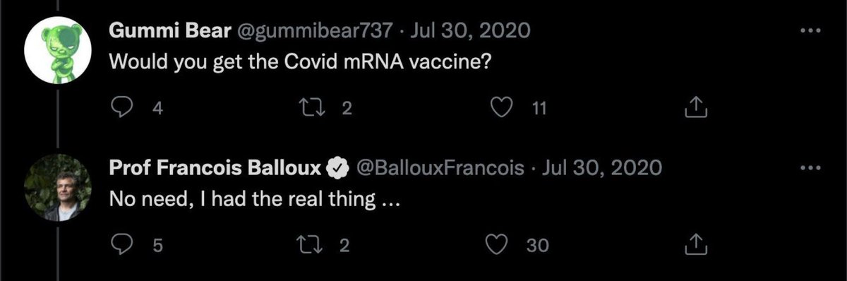 2) this guy (a UCL scientist) loves his natural immunity so much that he triumphantly proclaimed in July 2020 that he would not get the COVID mRNA vaccine because “I had the real thing”…. ➡️as he then proceeds to catch COVID at least 2 more times 👀. My god the gall.