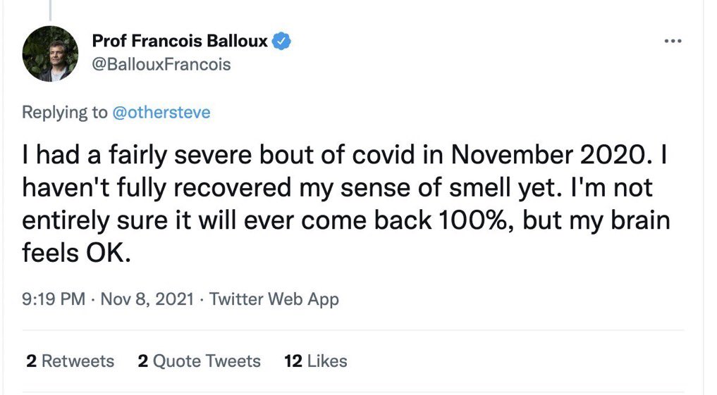 3) Also, apparently somehow zero self reflection on not having his sense of smell fully back after a whole year! The loss of smell from COVID is neurological — hence not sure if you can say the brain is fully okay if you have #LongCovid for that long.