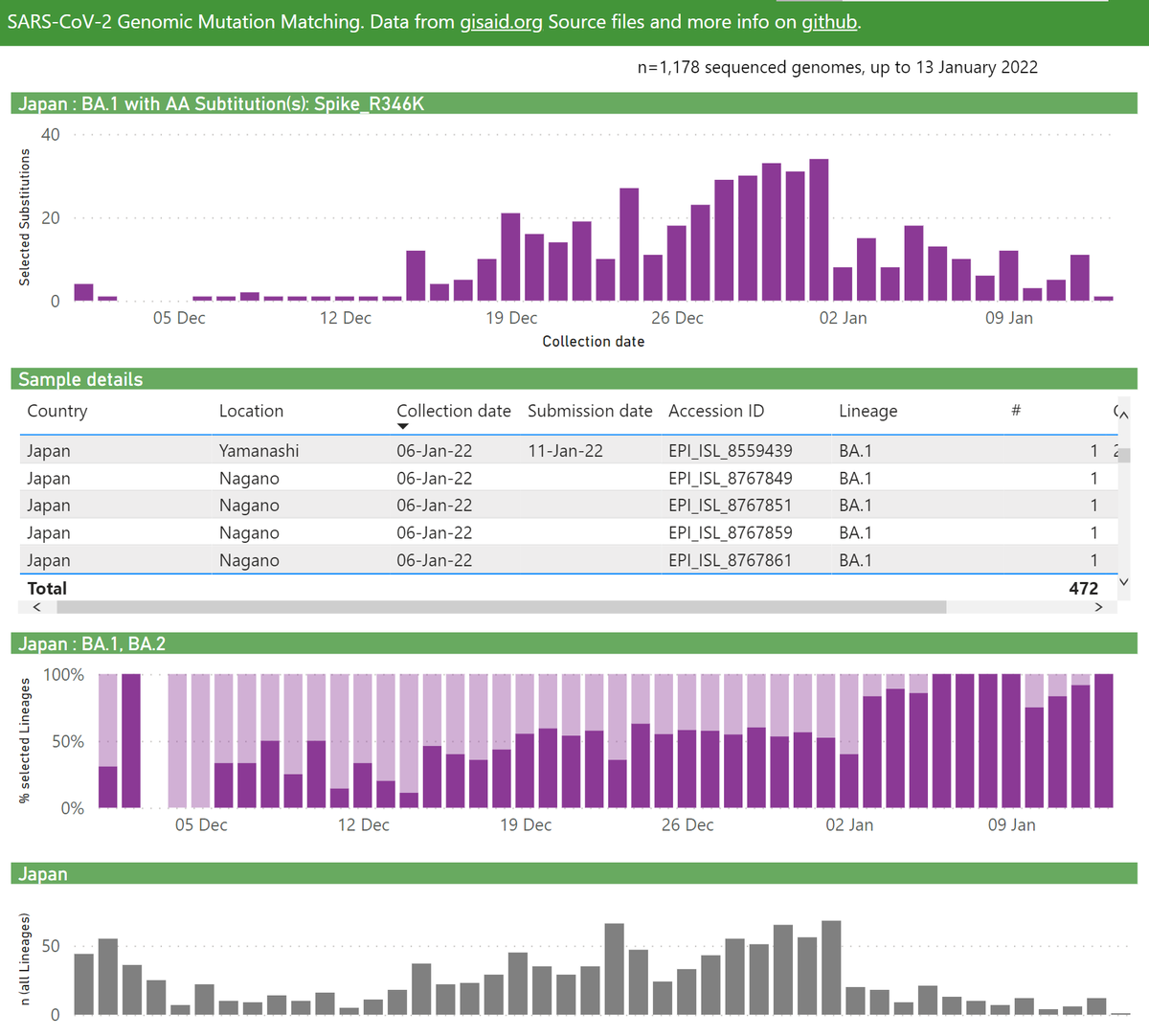 Japan's Omicron outbreak has predominantly been BA.1 with the Spike R346K mutation, recently at 90-100% (of all BA.1 samples).
