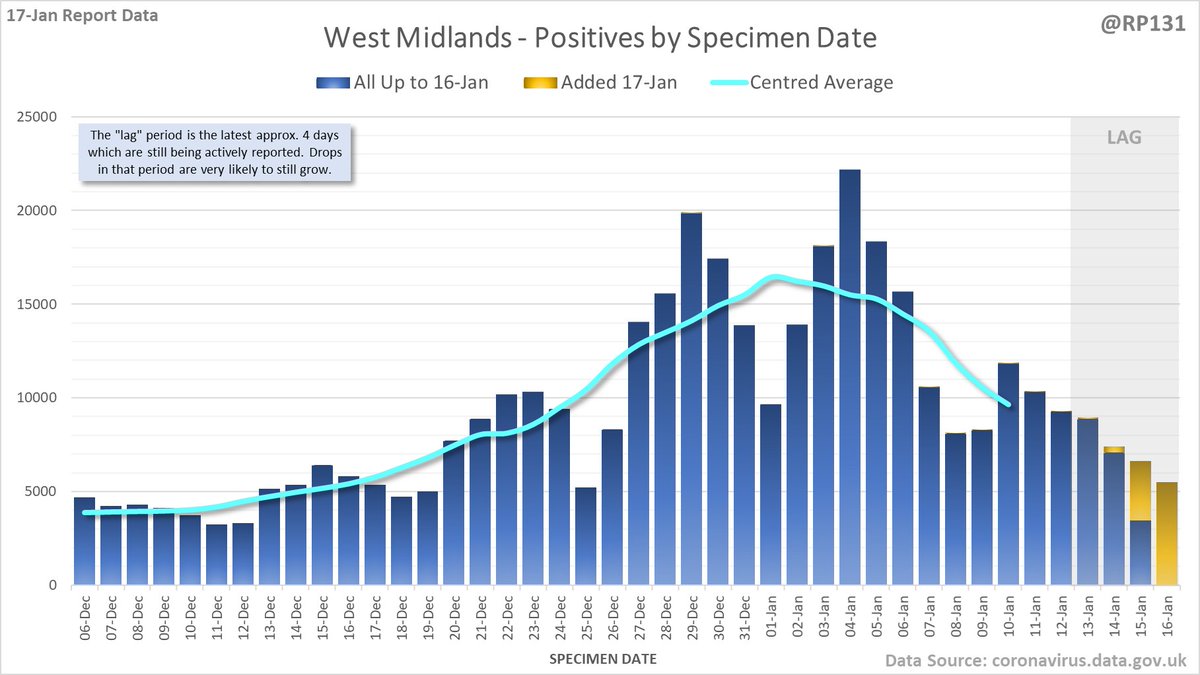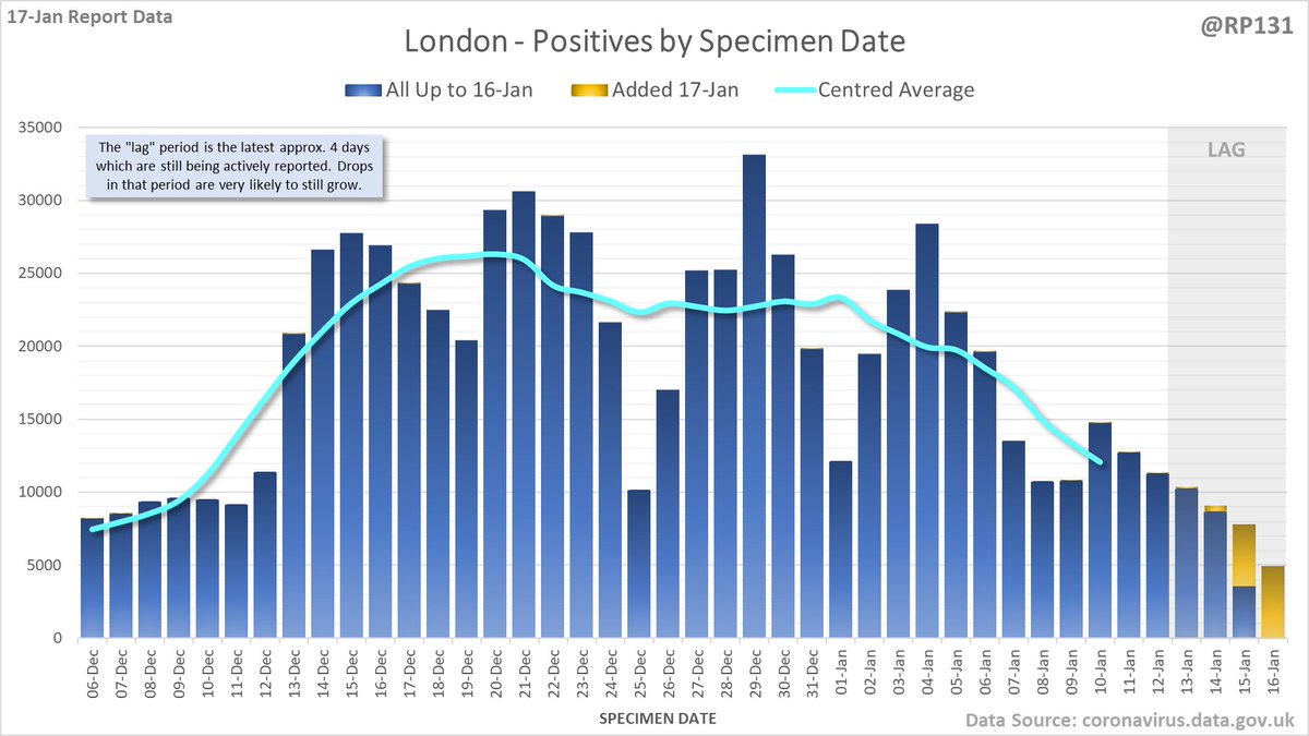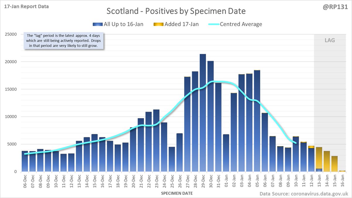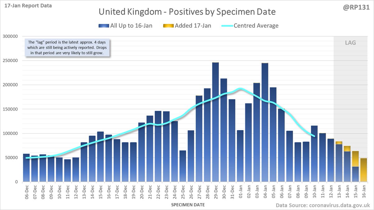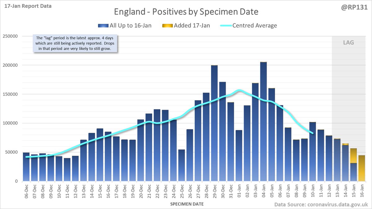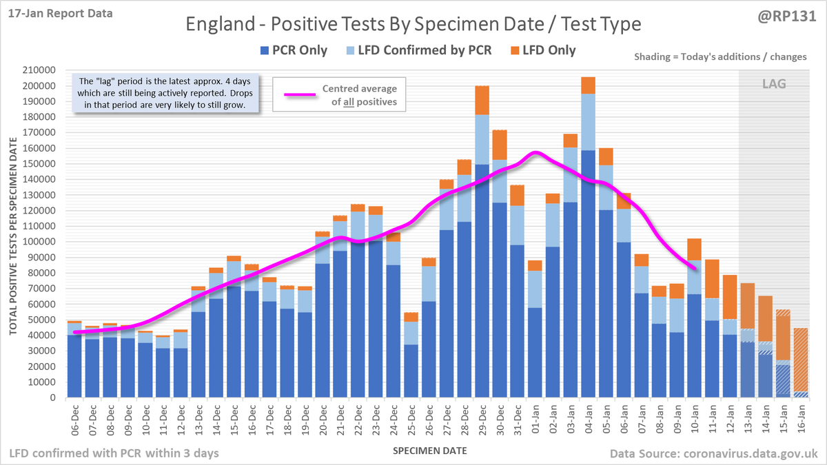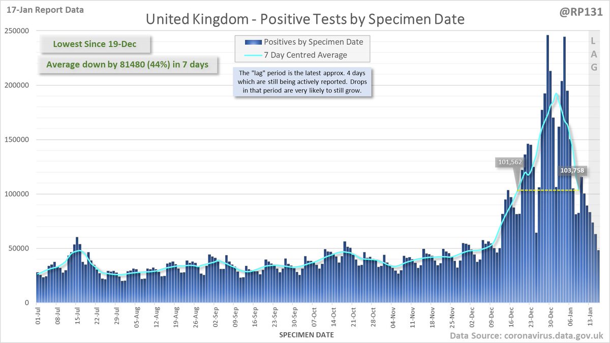 Longer term view. 84,429 new #covid19uk positive tests reported today (17-Jan). This brings the rolling average by specimen date (allowing 4 days for lag) to 103,758, equivalent to around 19-Dec (i.e. 22 days ago), a reduction of 81480 (44%) in the last week.