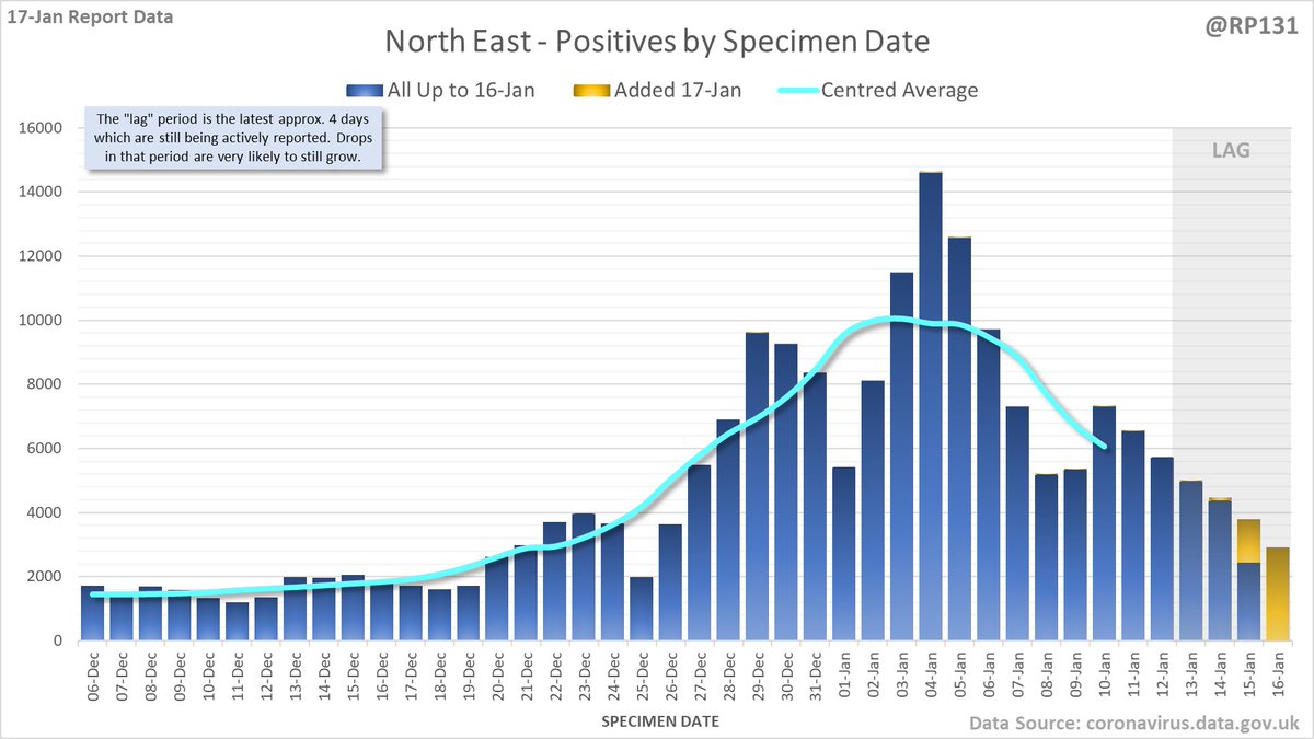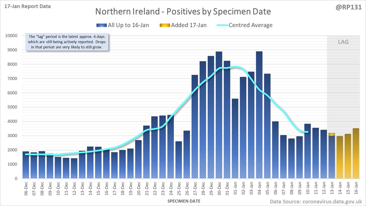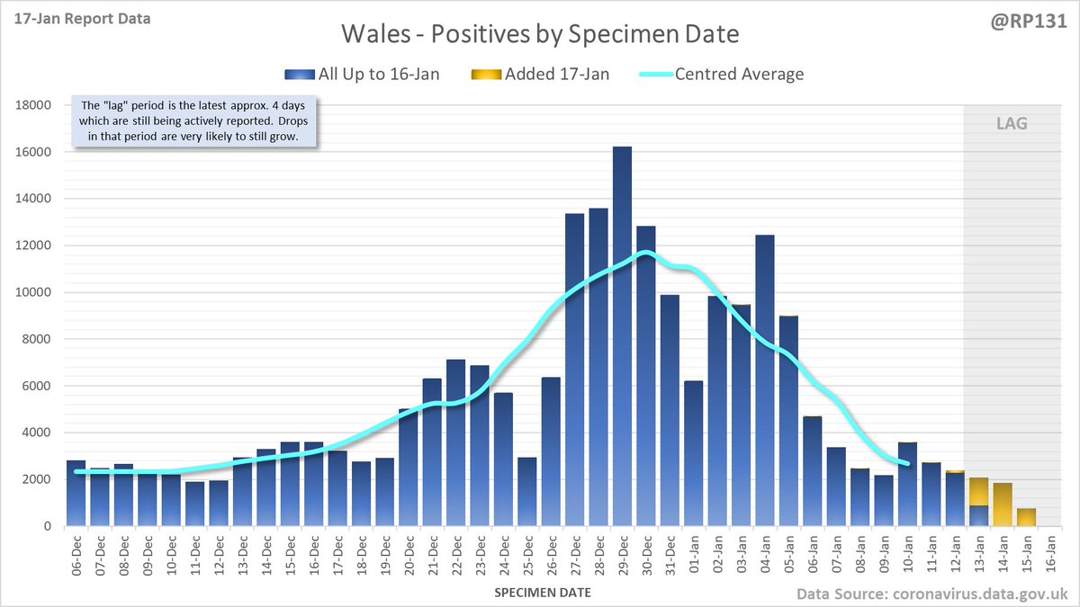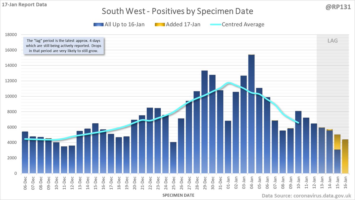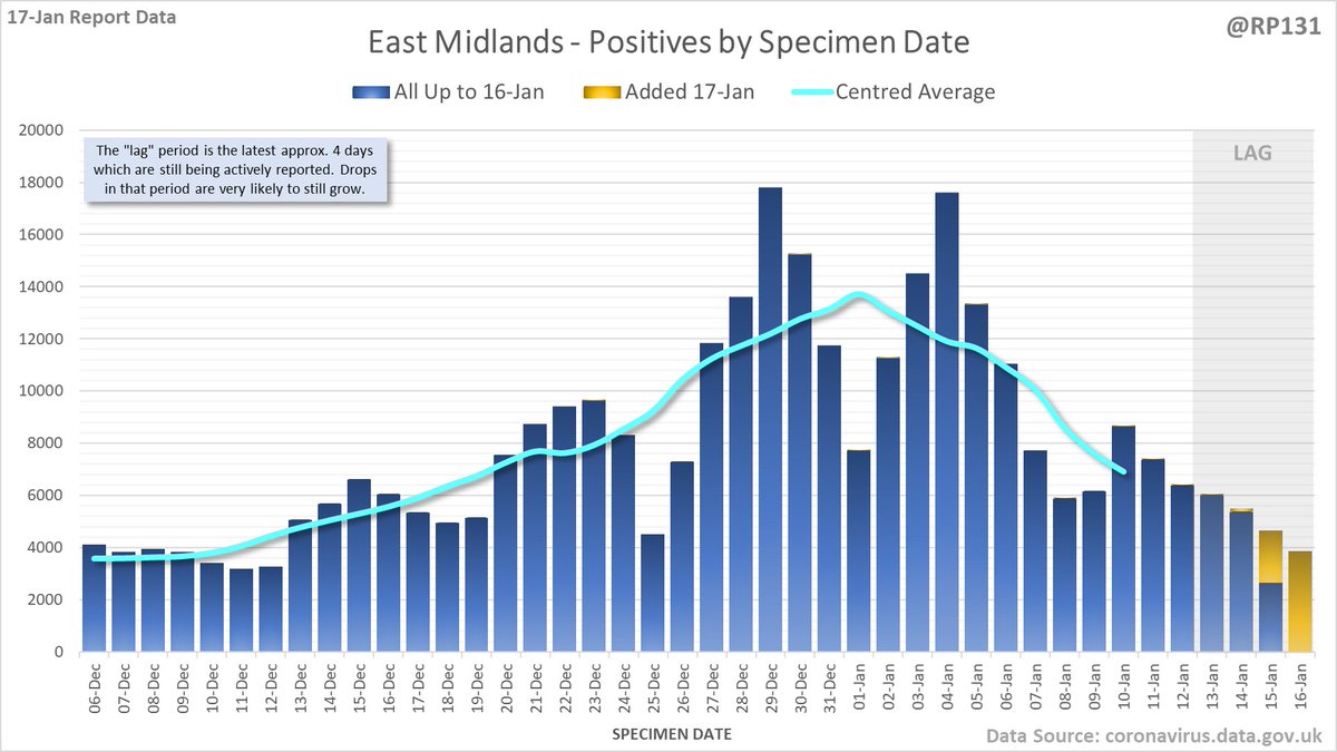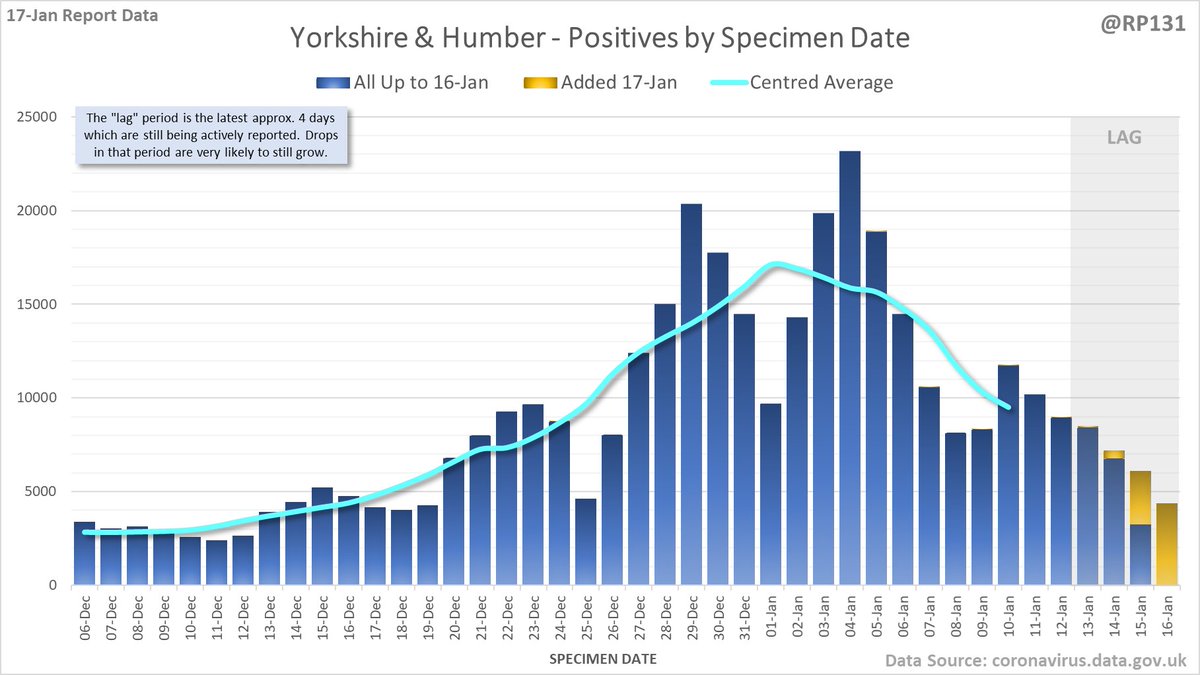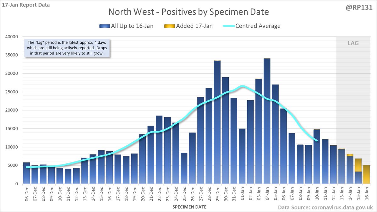Longer term view. 84,429 new #covid19uk positive tests reported today (17-Jan). This brings the rolling average by specimen date (allowing 4 days for lag) to 103,758, equivalent to around 19-Dec (i.e. 22 days ago), a reduction of 81480 (44%) in the last week.