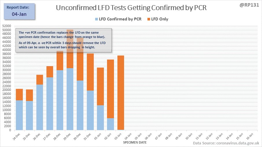 Animated chart to show LFD-only positives being either converted into PCR confirmed positives or removed due to negattive confirmation, over the last 14 days of reports.