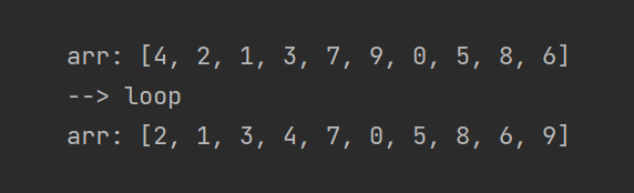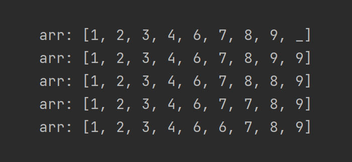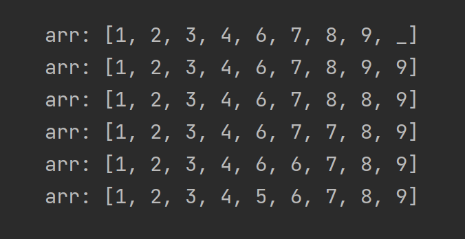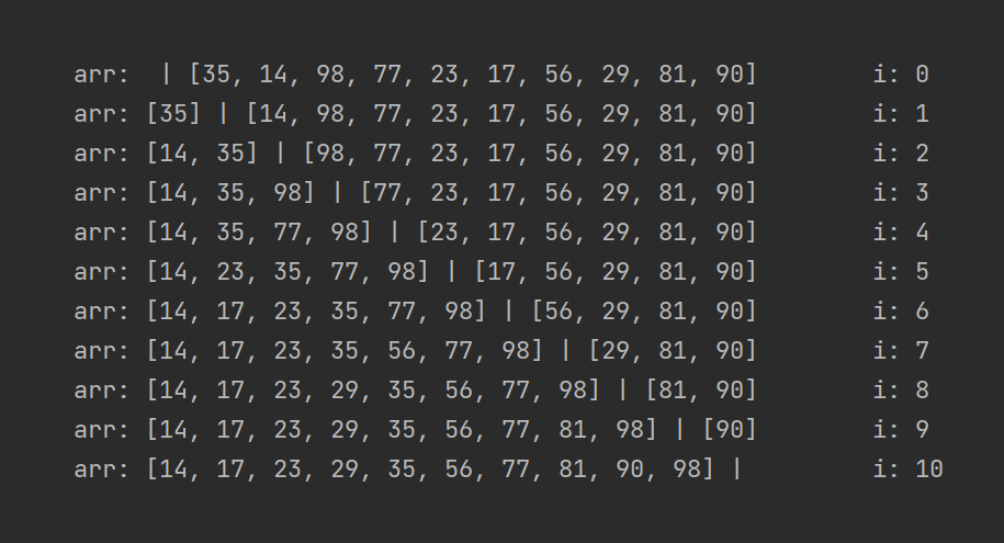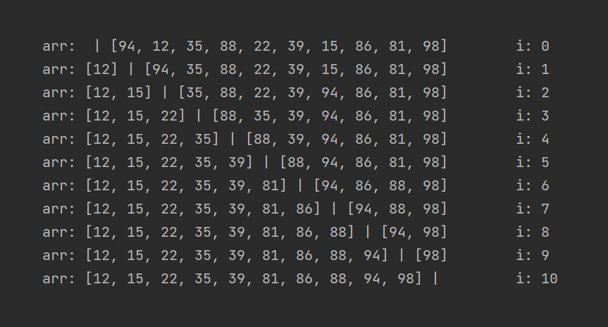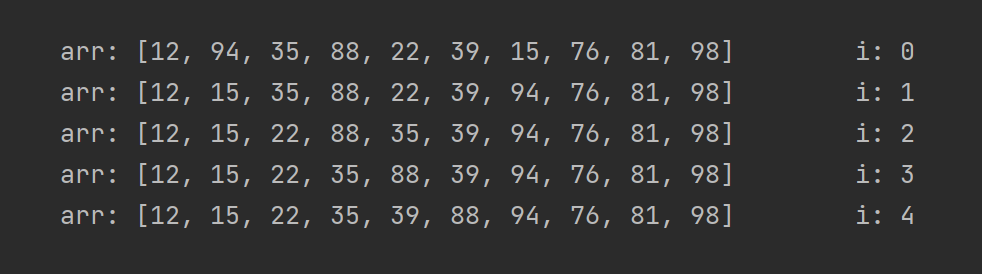 Для затравки посмотрим на состояние arr после нескольких проходов цикла в selection_sort(), то есть первых, например, пяти итераций. Просто чтобы попытаться заметить, что же такого делает наш алгоритм. Итак, состояния: