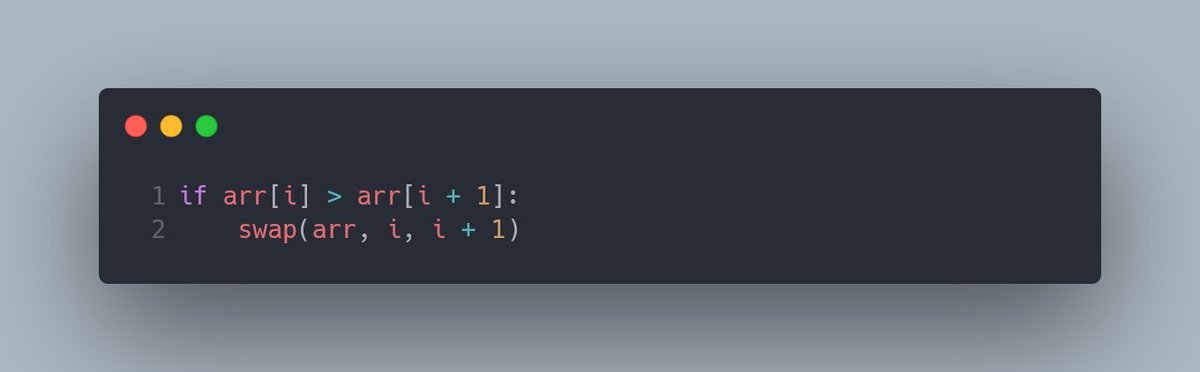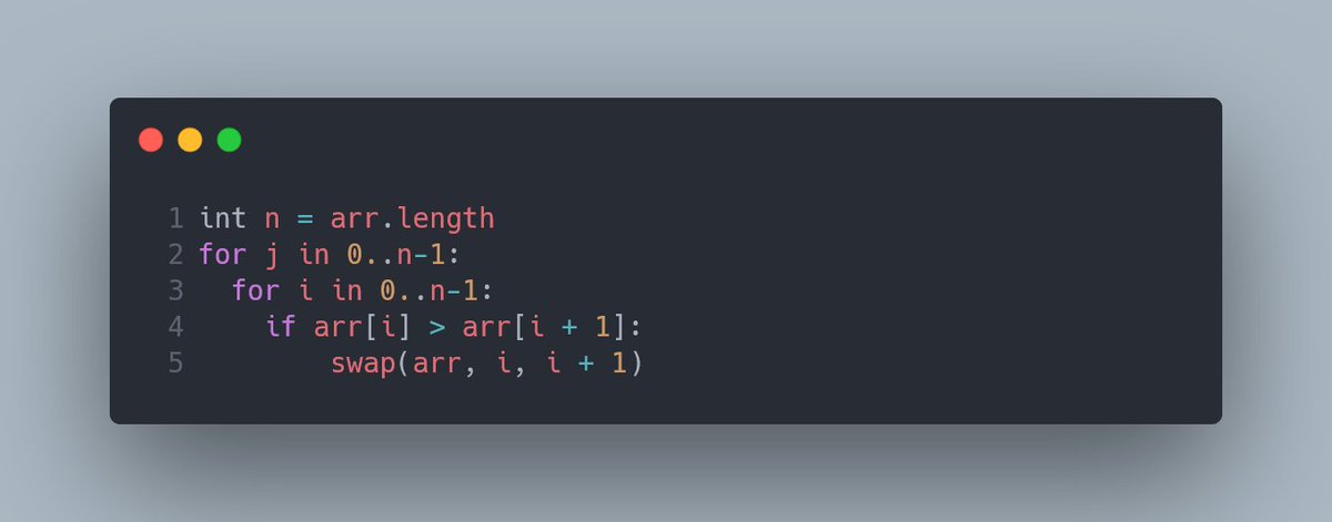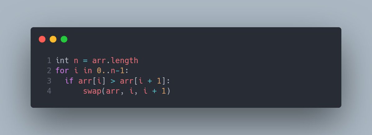 Сколько витков этих свопов нам нужно, чтоб гарантированно отсортировать массив? Если каждый виток ставит на место минимум один элемент, то через n витков мы гарантированно получим отсортированный массив!