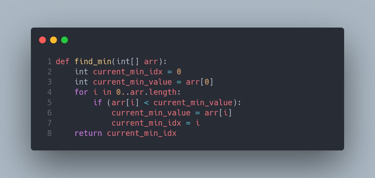 Суть find_min() максимально проста: за отправную точку берём первый элемент массива, называем это текущим минимумом. Далее поочерёдно сравниваем элементы массива с текущим минимумом, обновляя его значение, если обнаруживается элемент с меньшим значением.