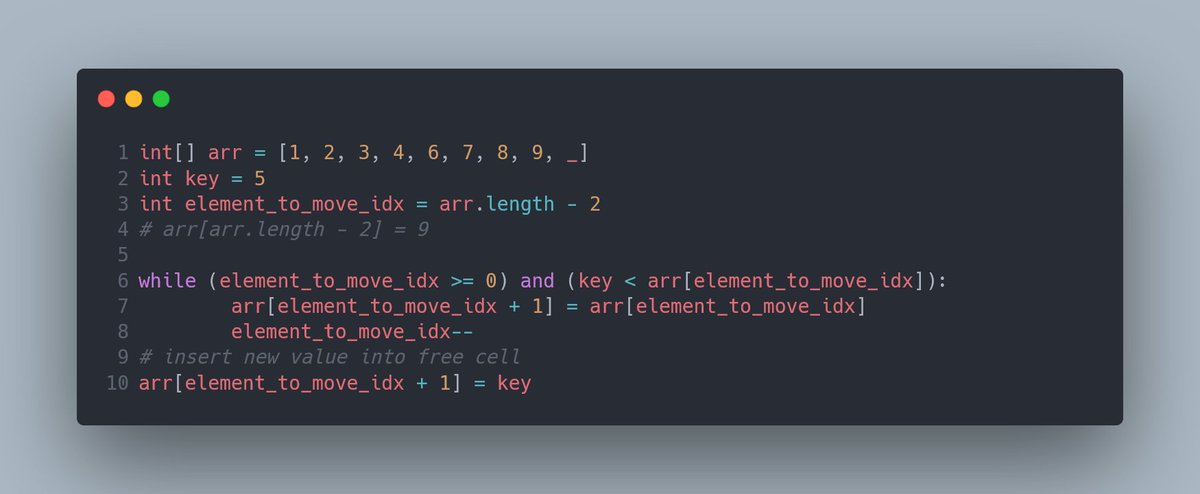 Вот маленький пример этой вставки, только вместо трамвая у нас отсортированный массив.