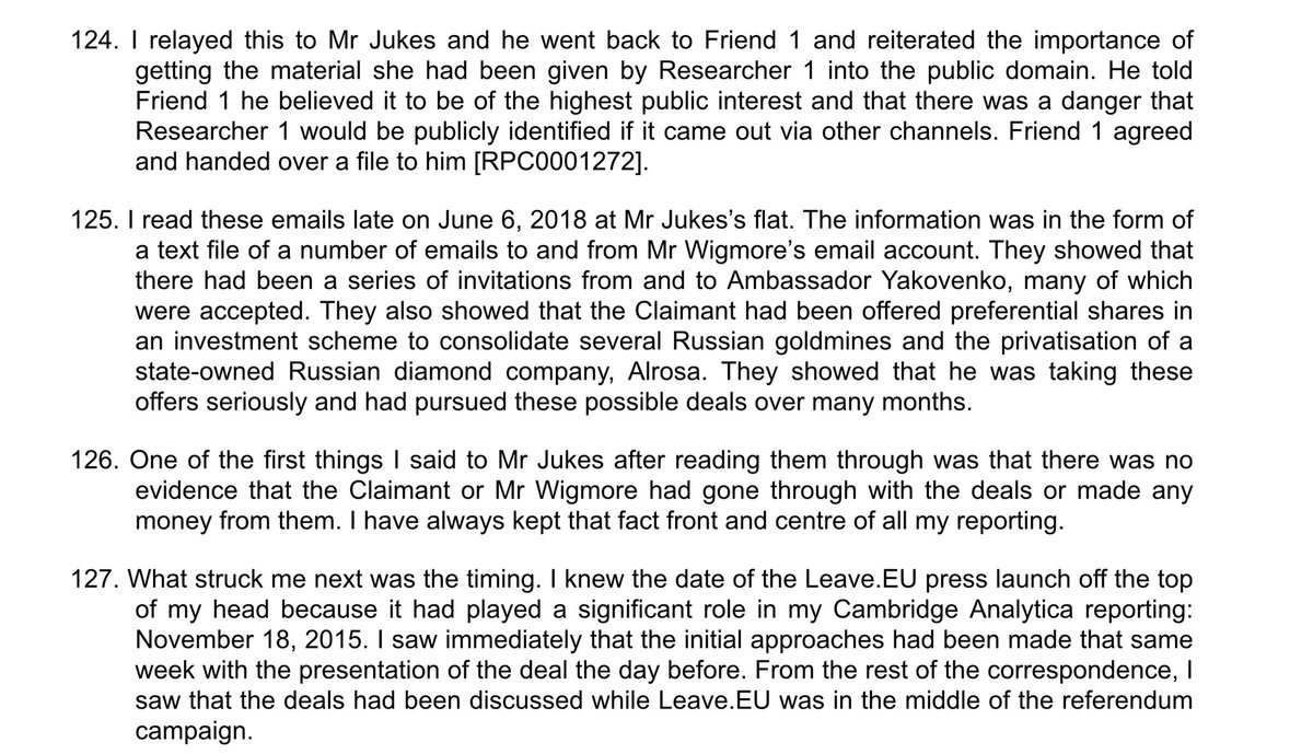 Another debate about references in the witness statement and Cadwalladr’s citation of @openDemocracy and another article about Banks’ diamond mines. Witness statement below