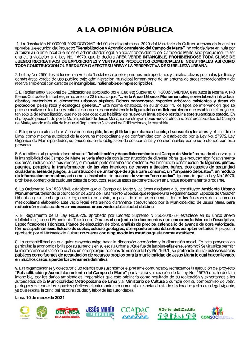 El Fondo Metropolitano de Inversiones de la Municipalidad de Lima pretende destinar 19 millones de soles para un proyecto bastante cuestionable en el Campo de Marte, y que los vecinos ya han denunciado como irregular. 1/8