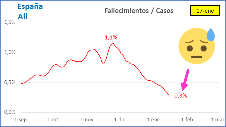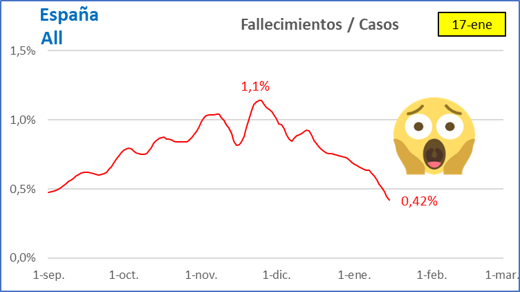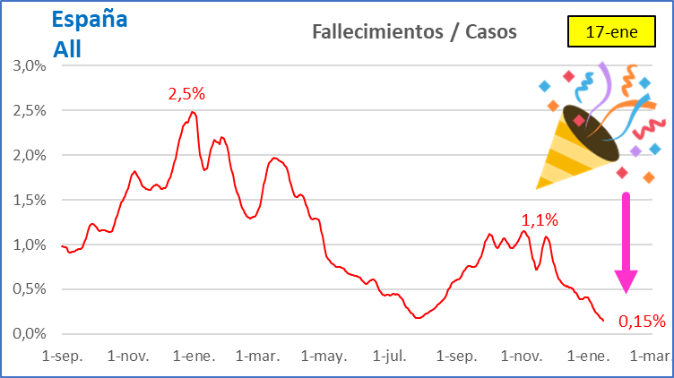 Si aplicamos el desfase Caso-Muerte de olas anteriores (2 semanas) obtenemos una Letalidad del 0,15% y además decreciente 😃