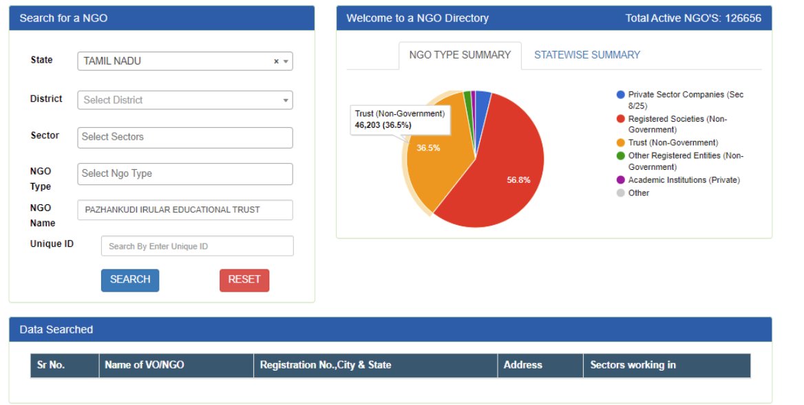 சோலையில் இருக்கும் 'PAZHANKUDI IRULAR EDUCATIONAL TRUST' என்ற பெயரில் NGO அரசு இணைய தளத்தில் இல்லை.